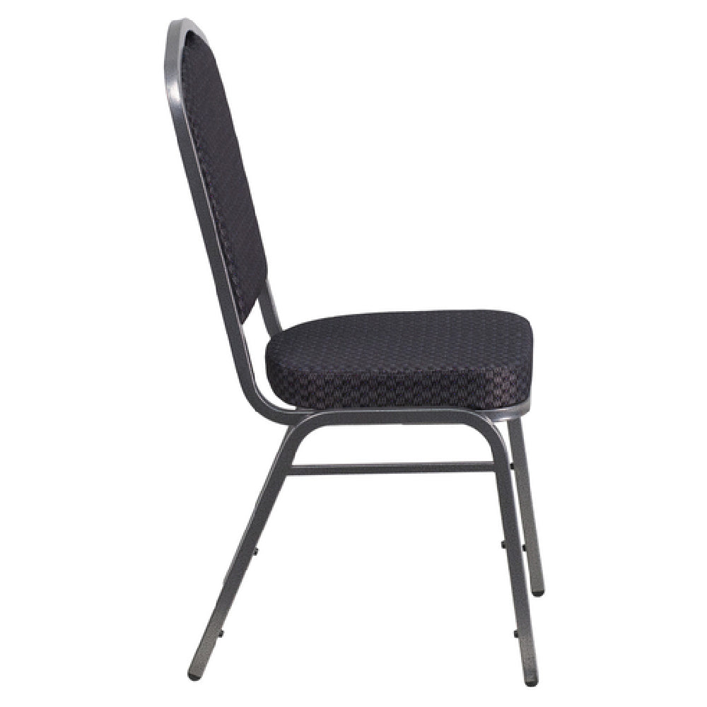 The Flash Furniture HF-C01-SV-E26-BK-GG Hercules Series Stacking Banquet Chair is engineered to meet the demanding needs of commercial environments, offering an impressive 500 lb. weight capacity. This chair features a crown design seamless back panel, enhancing both its aesthetic appeal and structural integrity. The seat and back are upholstered in patterned fabric, providing a comfortable and stylish seating option. A 2-1/2" thick CA117 fire retardant foam seat ensures safety and comfort. Built for durability, the chair includes double support braces and a 16 gauge steel frame, finished with a silver vein powder coating for enhanced durability and a sleek appearance. Plastic bumper guards are integrated to protect the chair during stacking, while the plastic floor glides ensure smooth movement and floor protection. This chair is designed for easy storage, capable of stacking up to 14 chairs high, making it an efficient choice for banquet halls, conference centers, and other venues that require flexible seating solutions. Available in black, the chair ships fully assembled, ensuring it is ready for immediate use, with in-stock items typically shipping within 24 hours. This combination of features makes the Hercules Series chair a reliable and versatile seating option for a variety of professional settings.