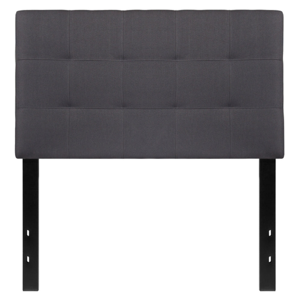 The Flash Furniture HG-HB1704-T-DG-GG Bedford Headboard Twin Size Contemporary Style is a versatile addition to modern bedrooms, offering a harmonious blend of style and functionality. This headboard is characterized by its upholstered tufted panel, which features a sophisticated box stitch design that adds a touch of elegance to any room setting. It is crafted with dark gray fabric, providing a neutral yet contemporary aesthetic that complements a wide range of interior decors. Supported by sturdy black metal stands, the headboard is equipped with adjustable bed rail slots, allowing for a customizable fit that can align with various bed frames. The adaptability of this product makes it suitable for different market segments, from residential users seeking a stylish bedroom upgrade to hospitality businesses aiming to enhance guestroom appeal. The headboard's contemporary style and functional design ensure it fits seamlessly into both minimalist and eclectic environments. Typically in stock and available for quick shipment within 24 hours, the Flash Furniture Bedford Headboard is a practical choice for those in need of a prompt and stylish bedroom solution. Its durable construction and elegant design combine to create a headboard that is not only visually appealing but also built to withstand everyday use.