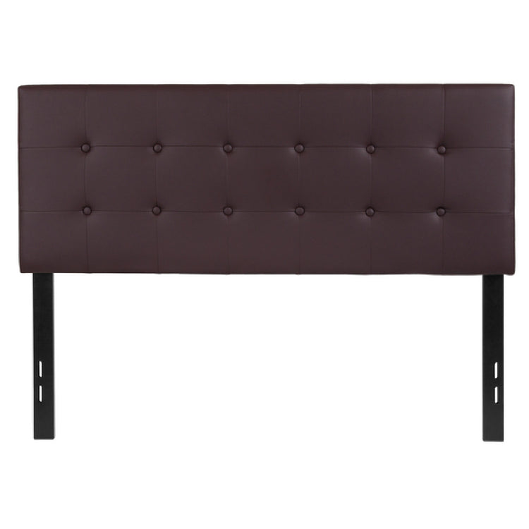 The Flash Furniture HG-HB1705-F-BR-GG Lennox Headboard Full Size Contemporary Style exemplifies modern elegance and functional design, ideal for a variety of bedroom décors. This full-size headboard is meticulously crafted with an upholstered button tufted panel that enhances its aesthetic appeal, creating a sophisticated focal point in any bedroom. Its box stitch design not only adds to its visual charm but also provides durability and structure. The headboard is supported by sturdy black metal stands, which are equipped with adjustable bed rail slots, ensuring compatibility with different bed frames and offering customization in height. Finished in a rich brown vinyl, this piece brings a touch of warmth and luxury to your space. Though assembly is required, the process is straightforward, allowing for quick setup. Inventory is well-managed, with the product typically shipping within 24 hours, providing prompt delivery for consumers. Its contemporary styling and versatile features make this headboard a valuable addition for homeowners seeking both style and functionality, as well as for designers looking for adaptable furniture solutions for modern living spaces.
