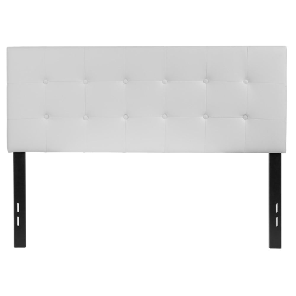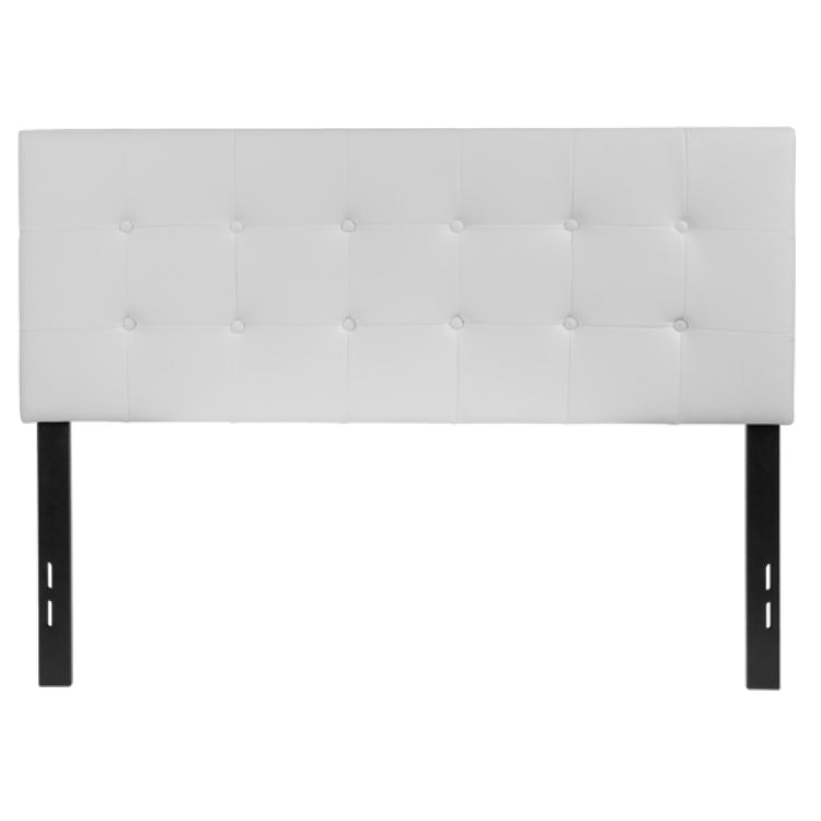 The Flash Furniture HG-HB1705-F-W-GG Lennox Headboard Full Size Contemporary Style is an elegantly designed piece that integrates seamlessly into a variety of bedroom aesthetics. It features an upholstered button tufted panel, exuding sophistication and comfort, ideal for homeowners seeking a touch of modern elegance. This full-size headboard is crafted with a box stitch design, enhancing its visual appeal and adding a textured dimension to its appearance. Supported by sturdy black metal stands, it comes equipped with adjustable bed rail slots, providing flexibility in installation and compatibility with various bed frames. Constructed from durable vinyl, this headboard is presented in a pristine white finish, making it a versatile addition that complements a wide range of interior color schemes. Assembly is required, though the straightforward design ensures that it can be set up with ease. Typically in stock, this item usually ships within 24 hours, ensuring prompt delivery for consumers eager to enhance their bedroom decor. The Flash Furniture Lennox Headboard is a testament to contemporary style and functional design, appealing to different market segments looking for reliable and aesthetically pleasing bedroom furniture solutions.