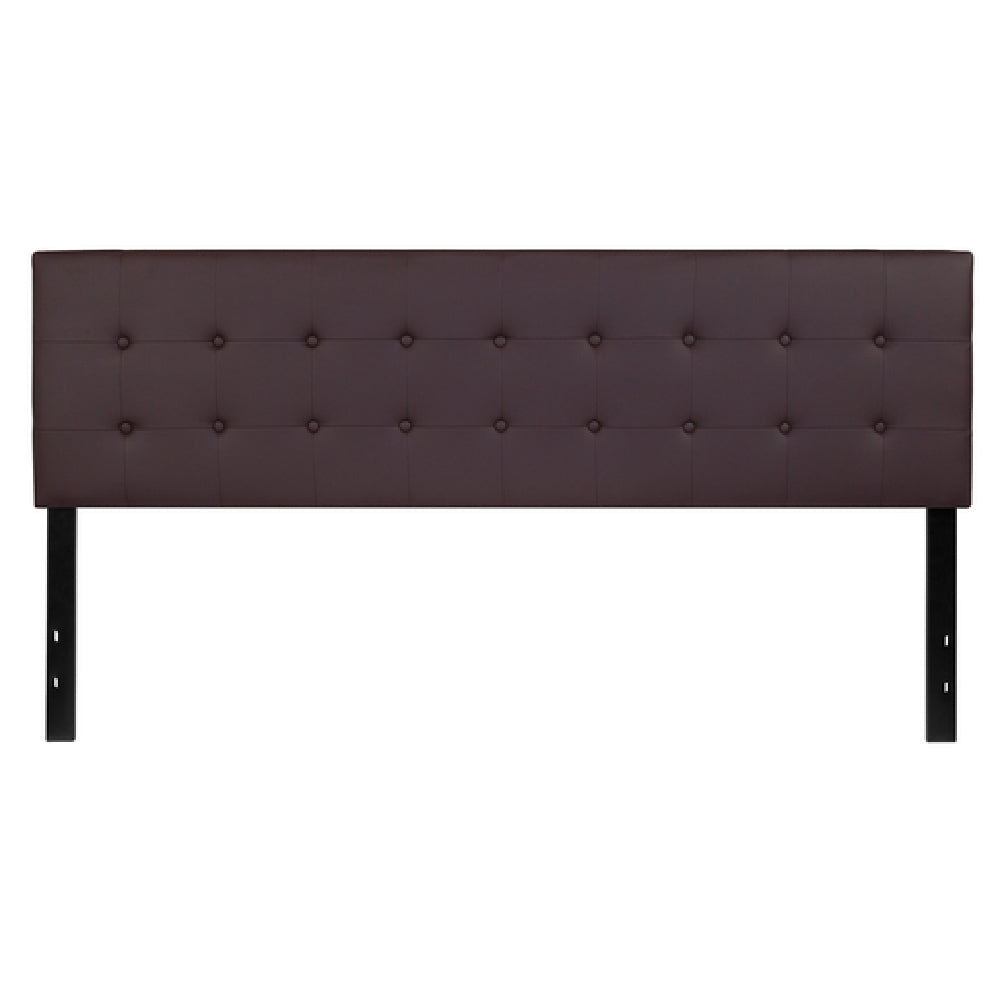 The Flash Furniture HG-HB1705-K-BR-GG Lennox Headboard King Size Contemporary Style is an exemplary blend of modern aesthetics and practicality, designed to elevate any bedroom setting. This king-size headboard features an elegant upholstered button tufted panel that complements its contemporary style, offering a touch of sophistication to your sleeping space. The box stitch design adds an element of texture and depth, enhancing its overall visual appeal. Supported by sturdy black metal stands, this headboard includes adjustable bed rail slots, ensuring compatibility with various bed frames for versatile installation options. Constructed from durable vinyl material in a classic brown finish, it promises longevity and easy maintenance. Typically shipping within 24 hours, the Flash Furniture Lennox Headboard is an ideal choice for individuals seeking a stylish and functional upgrade to their bedroom decor. Its thoughtful design and quality materials cater to diverse market segments, from residential customers aiming for a chic home makeover to hospitality sectors looking for durable and aesthetically pleasing furnishings. This headboard stands out as both a practical and stylish investment, perfect for those who appreciate contemporary design coupled with functional features.