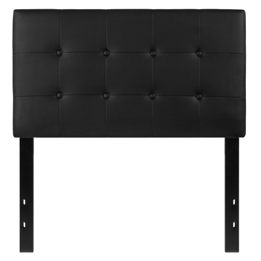 The Flash Furniture HG-HB1705-T-BK-GG Lennox Headboard Twin Size Contemporary Style is a modern and versatile addition to any bedroom. This twin-size headboard is designed with a contemporary style, featuring an upholstered button tufted panel that adds a touch of elegance and sophistication. Its box stitch design enhances the aesthetic appeal, making it a standout piece in any room. The headboard is supported by sturdy black metal stands, which include adjustable bed rail slots, allowing for a customizable fit with different bed frames. Made from durable vinyl in a sleek black color, the Lennox Headboard seamlessly blends with various bedroom decors. This headboard is typically in stock and ready for shipment within 24 hours, ensuring a quick and efficient delivery process. The Flash Furniture Lennox Headboard caters to diverse segment markets, from individuals seeking to update their personal bedroom design to hospitality businesses aiming to furnish guest rooms with stylish and functional furniture. Its contemporary design and practical features make it a unique value proposition in the industry, appealing to both residential and commercial consumers looking for quality and style in their furniture selections.