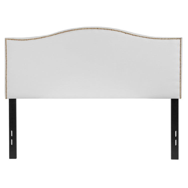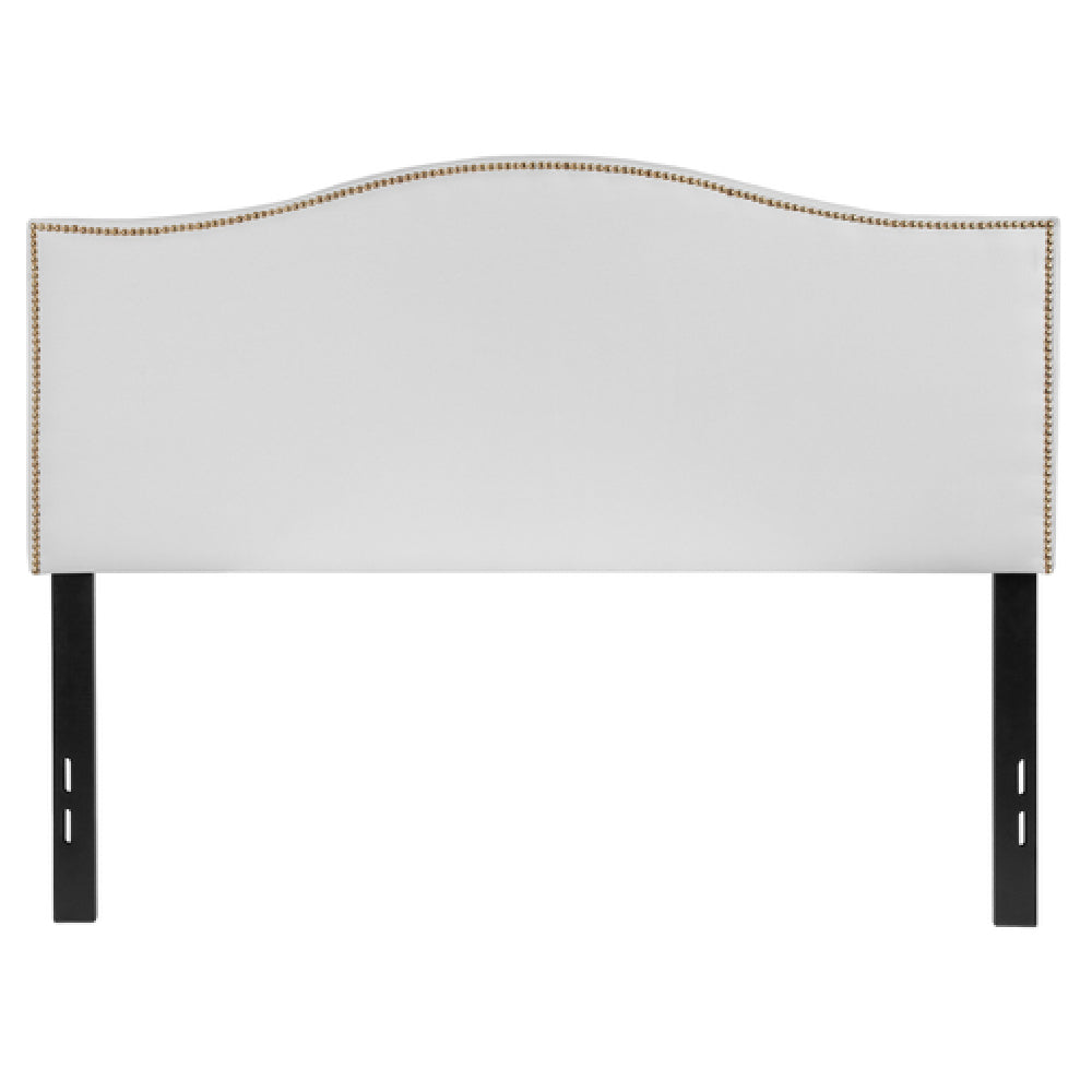 The Flash Furniture HG-HB1707-F-W-GG Lexington Headboard Full Size Transitional Style is a meticulously designed piece that offers both aesthetic appeal and functional versatility. This full-size headboard features an upholstered panel complemented by an elegant arched top, adding a sophisticated touch to any bedroom decor. The design is further enhanced by brass nailhead trim, which adds a classic detail to the transitional style of the headboard. Supported by sturdy black metal stands, this headboard includes adjustable bed rail slots, providing compatibility with various bed frames. Crafted from high-quality fabric, the headboard is presented in a pristine white color, making it a versatile choice for a range of bedroom interiors. Assembly is required for this product, ensuring a secure and personalized setup. The Flash Furniture Lexington Headboard is typically available for shipping within 24 hours, making it a convenient option for those seeking a stylish and functional addition to their bedroom ensemble. This headboard stands out in the market for its combination of style, durability, and ease of assembly, catering to both individual consumers and larger commercial entities looking for reliable and elegant bedroom furnishings.