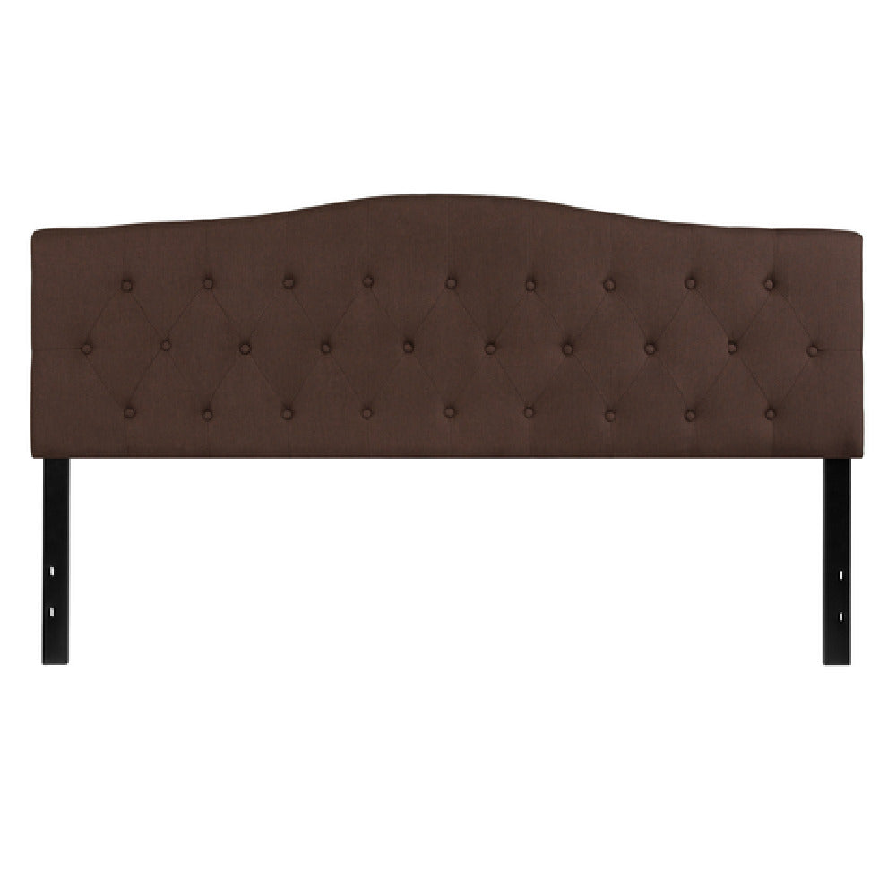 Flash Furniture HG-HB1708-K-DBR-GG Cambridge Headboard King Size Contemporary Style is an exemplary piece that seamlessly blends modern design with functional elegance. This king-size headboard is crafted with a focus on contemporary aesthetics, featuring an upholstered button tufted panel that adds a touch of sophistication to any bedroom setting. The headboard flaunts diamond pattern stitching, enhancing its visual appeal while offering a plush and comfortable backrest. It is supported by sturdy black metal stands, which come equipped with adjustable bed rail slots, ensuring a perfect fit for various bed frames. The fabric is a rich dark brown, making it a versatile choice for diverse interior decors. Typically in stock and ready to ship within 24 hours, this headboard caters to the needs of immediate furnishing solutions. Its thoughtful design and robust construction make it an asset for residential spaces, boutique hotels, or high-end apartment complexes seeking to elevate their bedroom aesthetics. The Flash Furniture Cambridge Headboard is not just a piece of furniture; it’s a statement of style and utility, crafted to meet the expectations of various market segments within the furniture industry.