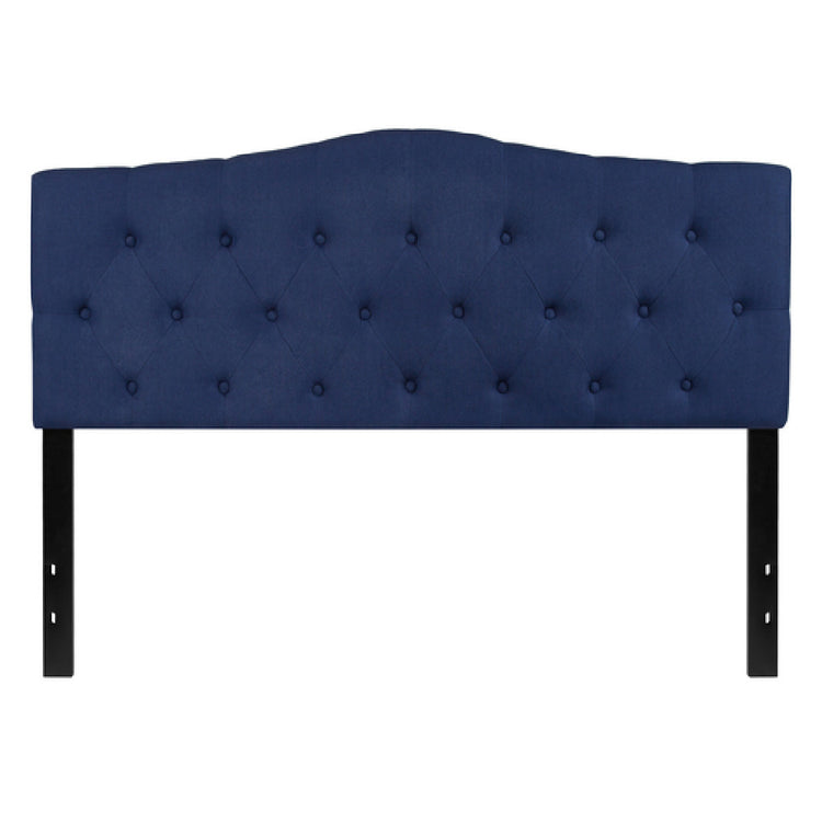The Flash Furniture HG-HB1708-Q-N-GG Cambridge Headboard Queen Size Contemporary Style is a sophisticated addition to any modern bedroom, blending elegance with functionality. Sculpted with an upholstered button tufted panel, this headboard showcases exquisite diamond pattern stitching, providing a visually stunning focal point. Its navy fabric upholstery adds a touch of color and refinement, versatile enough to complement various bedroom themes. Designed with practicality in mind, the headboard is supported by sturdy black metal stands, which include adjustable bed rail slots to accommodate different bed frame configurations. This queen size headboard is not only a testament to contemporary design but also a versatile piece suitable for diverse market segments, from residential customers seeking to enhance their bedroom's aesthetic to hospitality businesses aiming to offer their guests luxurious accommodations. With its sleek design and durable construction, the Flash Furniture Cambridge Headboard delivers both style and substance, making it an appealing choice for those who value both form and function. Ready for immediate shipment, this headboard promises to add a touch of elegance to your living space within 24 hours of order placement.