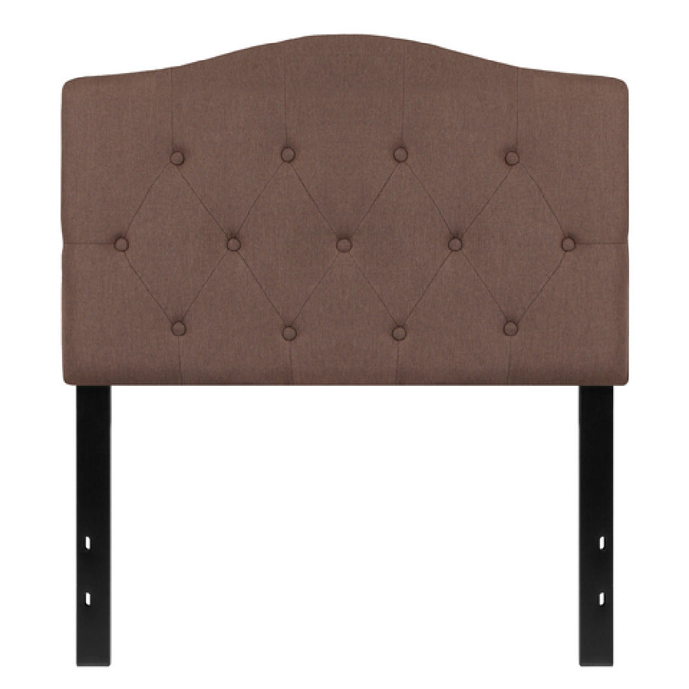The Flash Furniture HG-HB1708-T-C-GG Cambridge Headboard Twin Size Contemporary Style is a sophisticated addition to any bedroom, designed to accommodate twin-sized beds with an emphasis on modern aesthetics. This headboard features an upholstered button tufted panel that showcases an elegant diamond pattern stitching, contributing to its contemporary charm. The headboard is supported by sturdy black metal stands, which come equipped with adjustable bed rail slots, offering versatility and compatibility with various bed frame configurations. The fabric finish in camel provides a neutral tone that seamlessly integrates into diverse interior design schemes. This product is typically in stock and has an efficient shipping timeframe, usually dispatching within 24 hours. Ideal for residential or commercial settings, the headboard combines style with functionality, making it suitable for various segment markets within the furniture industry. Its design and features cater to those seeking a blend of modern style and practical adjustability, ensuring it meets the demands of both aesthetic and functional requirements. The Flash Furniture Cambridge Headboard stands as a testament to quality craftsmanship and thoughtful design, tailored to enhance the bedroom experience while maintaining a focus on contemporary elegance.