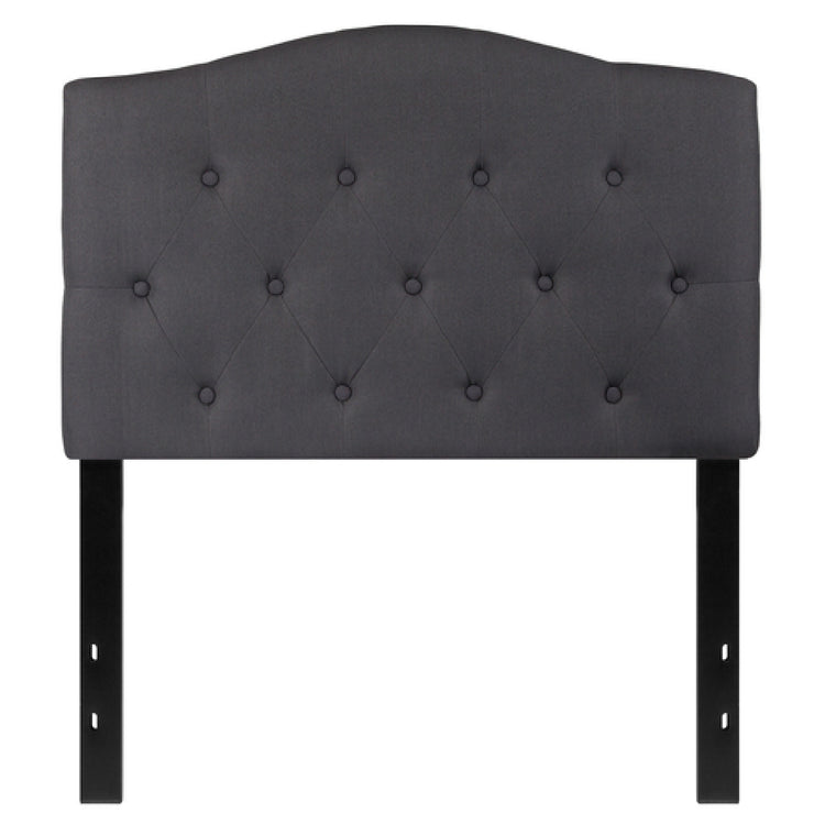 The Flash Furniture HG-HB1708-T-DG-GG Cambridge Headboard Twin Size Contemporary Style is an aesthetically pleasing piece designed to enhance any bedroom setting with its modern appeal. This headboard features a luxurious upholstered button tufted panel, which is expertly crafted with diamond pattern stitching that adds a touch of elegance and sophistication. The dark gray fabric provides a versatile color option that complements a wide range of interior decor styles. Technically designed for optimal functionality, the headboard is supported by sturdy black metal stands equipped with adjustable bed rail slots, ensuring compatibility with various bed frames and an easy setup process. The contemporary style of the HG-HB1708-T-DG-GG makes it a perfect choice for consumers seeking a blend of comfort and modern design in their sleeping environment. Typically available for quick delivery, this headboard usually ships within 24 hours, making it an attractive option for those needing a timely furnishing solution. This headboard not only contributes to the aesthetic value of a room but also offers practical benefits through its robust construction and adaptable design, catering to diverse market segments including residential spaces, hospitality settings, and interior design projects.