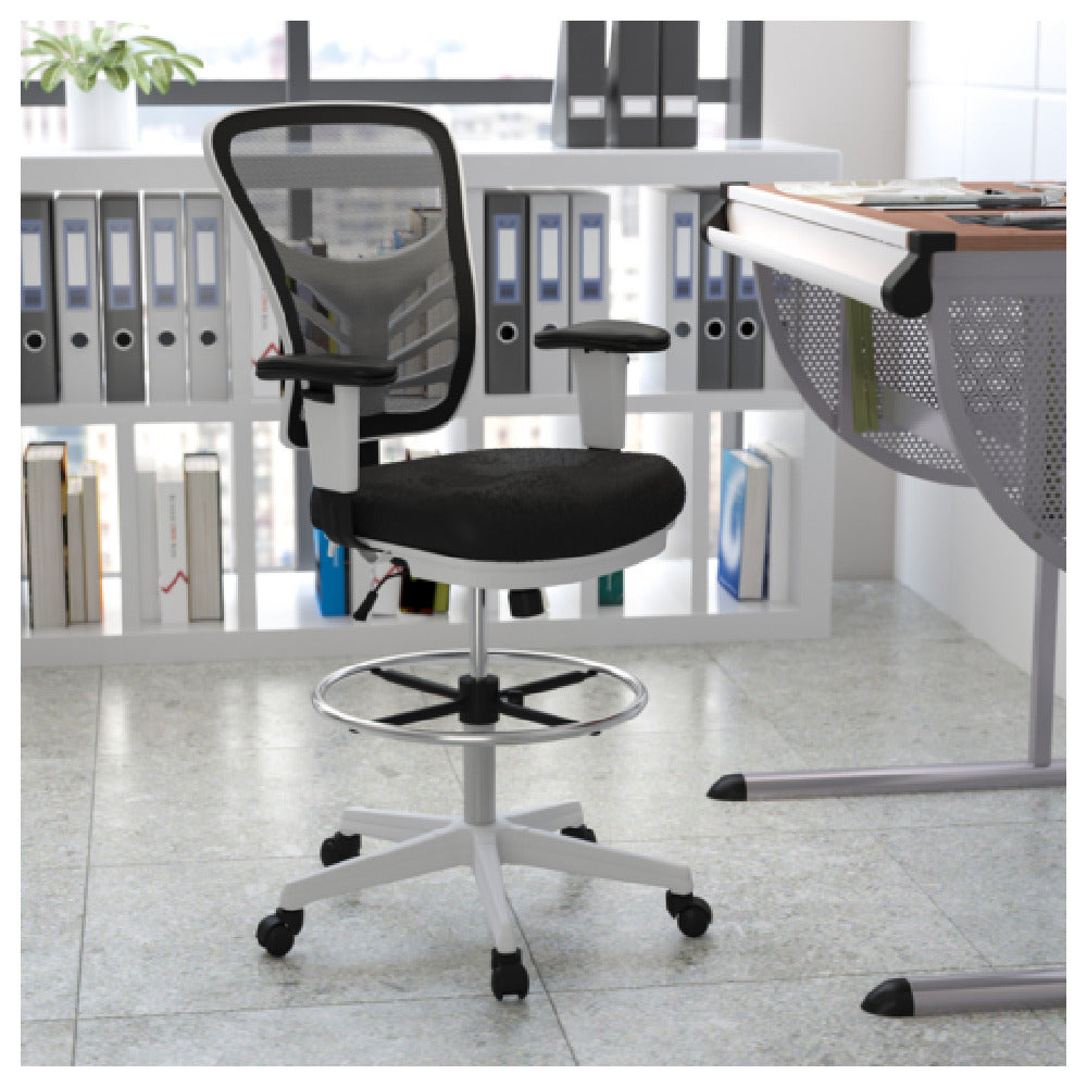 The Flash Furniture HL-0001-1CWHITE-GG Tyler Drafting Chair 23-1/2" to 31-1/2" Adjustable Seat Height is a versatile seating option, designed for a range of professional environments. With a mid-back design, this chair provides essential support and comfort during prolonged use, while the padded mesh upholstered seat enhances breathability and reduces fatigue. The chair showcases a weight capacity of 250 lb., accommodating various user needs. Its adjustable features, including pneumatic seat height adjustment from 23-1/2" to 31-1/2", height adjustable padded arms, and an adjustable foot ring, cater to different body types and preferences, ensuring ergonomic seating. Safety and durability are prioritized with CA117 fire retardant foam, making it a reliable choice for office settings. The tilt lock mechanism and tilt tension adjustment knob allow for flexible positioning tailored to user comfort. Constructed with a sturdy nylon base and dual wheel casters, this drafting chair, with its white frame and black mesh design, requires assembly. Ideal for architects, artists, and professionals in similar fields, the Flash Furniture Tyler Drafting Chair delivers both functionality and style in workspace seating solutions.