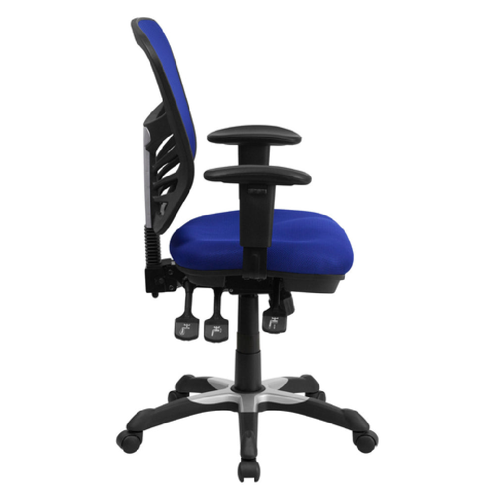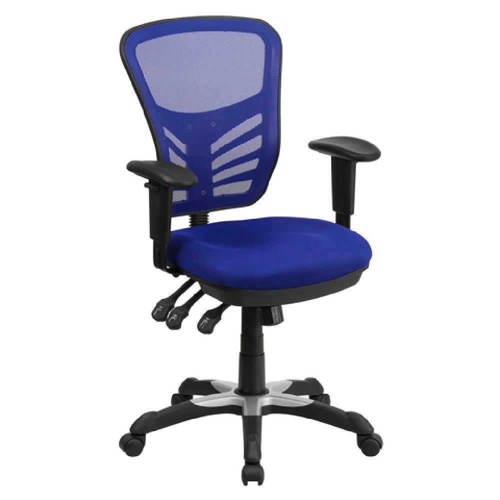 The Flash Furniture HL-0001-BL-GG Swivel Task Chair 36-3/4" To 43-1/2" Adjustable Height is an ergonomic solution tailored for diverse professional environments, emphasizing both comfort and functionality. This chair supports a weight capacity of up to 250 lbs and features a mid-back design with a 2" adjustable mesh back, providing essential lumbar support through its built-in mechanism. The chair's padded mesh upholstered seat ensures comfort during long working hours. Equipped with a triple paddle control mechanism, it offers an infinite-locking back angle adjustment, multi-tilt lock mechanism, and a tilt tension adjustment knob, allowing users to customize their seating experience. The height adjustable padded arms enhance user convenience and adaptability. Safety is underscored with CA117 fire retardant foam. The chair's durability is highlighted by a heavy-duty black nylon base with silver accents, complemented by dual wheel casters for smooth mobility. Available in blue, this chair requires assembly and is ready for shipment, usually within 24 hours. The Flash Furniture HL-0001-BL-GG Swivel Task Chair combines technical precision with user-centric design, making it a preferred choice for offices seeking a balance of style, support, and versatility.