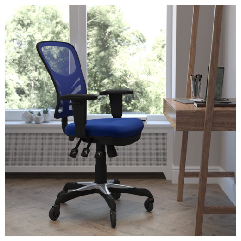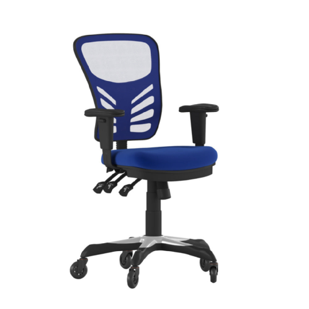 The Flash Furniture HL-0001-BL-RLB-GG Nicholas Swivel Task Chair, with its adjustable height range of 37" to 44-1/4", is engineered to meet versatile workplace needs across different industry sectors. This chair accommodates up to 250 lbs, making it suitable for a wide range of users. Its mid-back design coupled with a mesh back and padded mesh upholstered seat ensures comfort and breathability for extended periods of use. Enhanced support is provided by the built-in lumbar feature, catering to ergonomic requirements. The triple paddle control mechanism allows for precise adjustments with an infinite-locking back angle adjustment and a multi-tilt lock mechanism, offering customization for various seating preferences. Additional functionality is provided by the tilt tension adjustment knob and height-adjustable padded arms, which enhance user comfort. Safety and durability are prioritized with the inclusion of CA117 fire retardant foam. The chair's heavy-duty black nylon base with silver accents and ball-bearing poly roller wheels combine for easy mobility and stability in dynamic office environments. This assembly-required chair is presented in blue, adding a vibrant touch to professional settings, making it a valuable asset for diverse markets needing adaptable and reliable seating solutions.