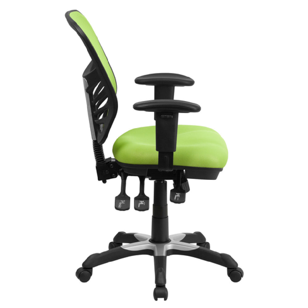 The Flash Furniture HL-0001-GN-GG Swivel Task Chair 36-3/4"-43-1/2" Adjustable Height is engineered for comfort and versatility, accommodating a weight capacity of 250 lb. This mid-back chair features a 2" adjustable mesh back and a padded mesh upholstered seat, ensuring breathability and support. It integrates a built-in lumbar support for ergonomic seating, promoting healthy posture. The chair is equipped with a triple paddle control mechanism, enabling users to fine-tune their sitting position with infinite-locking back angle adjustment and a multi-tilt lock mechanism. The tilt tension adjustment knob allows for personalized recline resistance, while the height adjustable padded arms provide additional comfort for various tasks. Constructed with CA117 fire retardant foam, it meets safety standards without compromising on comfort. The chair's heavy-duty black nylon base with silver accents offers durability and style, complemented by dual wheel casters for smooth mobility. Available in green and requiring assembly, this chair typically ships within 24 hours when in stock. Its comprehensive features make it an ideal seating solution across different market segments, from office environments to home workspaces, where adaptable comfort and durable design are essential.