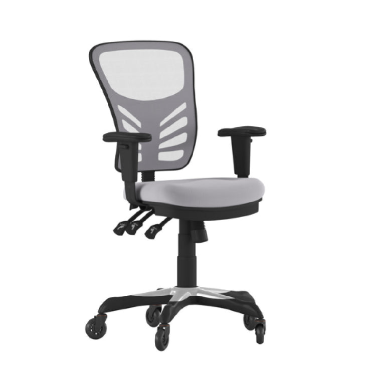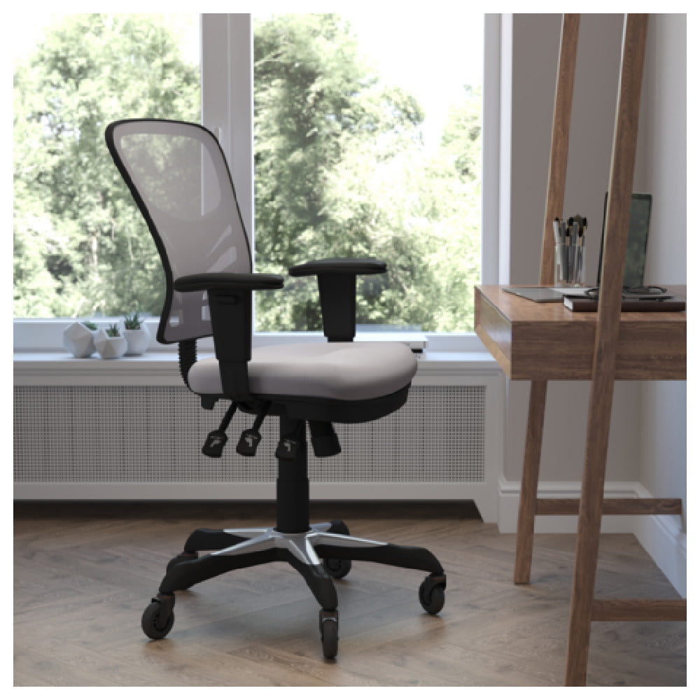 The Flash Furniture HL-0001-GY-RLB-GG Nicholas Swivel Task Chair is a versatile seating solution designed for various professional environments. With an adjustable height range of 37 to 44-1/4 inches, this chair accommodates users of different statures, while its 250 lb. weight capacity ensures it is suitable for a broad range of individuals. The mid-back design, complemented by a mesh back and padded mesh upholstered seat, provides optimal comfort and breathability. Essential for long working hours, the built-in lumbar support alleviates stress on the lower back. The chair's triple paddle control mechanism allows for easy adjustments, including an infinite-locking back angle adjustment and a multi-tilt lock mechanism, offering personalized seating positions. The tilt tension adjustment knob further enhances comfort by allowing users to set the reclining resistance to their preference. Height adjustable padded arms add to the chair’s ergonomic features. Constructed with CA117 fire retardant foam, it meets safety standards. The heavy-duty black nylon base, accented with silver, ensures stability and durability, while the ball-bearing poly roller wheels enable smooth mobility. This chair, finished in a sleek gray, requires assembly, making it a practical and stylish choice for office settings.