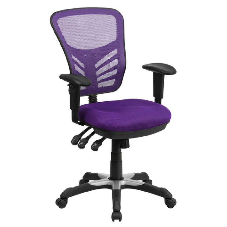 The Flash Furniture HL-0001-PUR-GG Swivel Task Chair 36-3/4" to 43-1/2" Adjustable Height is a versatile seating solution engineered for adaptability and comfort across multiple professional settings. Featuring a mid-back design and a 250 lb. weight capacity, it caters to various body types and user preferences. The chair's mesh back adjusts 2" for enhanced airflow and comfort, and its padded mesh upholstered seat provides lasting support. Key ergonomic features include a built-in lumbar support and a triple paddle control mechanism, allowing infinite-locking back angle adjustment and multi-tilt lock mechanism for personalized posture alignment. The chair is equipped with an adjustable height range from 36-3/4" to 43-1/2", accommodating different desk heights. Its height adjustable padded arms add to the user's comfort and support. Constructed with CA117 fire retardant foam, the chair prioritizes safety alongside functionality. A heavy-duty black nylon base with silver accents and dual wheel casters offers stability and ease of movement. The distinctive purple color adds a vibrant touch to any office environment. Suitable for diverse markets, this chair meets the demands of both home office users and corporate environments alike. Assembly is required, and in-stock items typically ship within 24 hours.