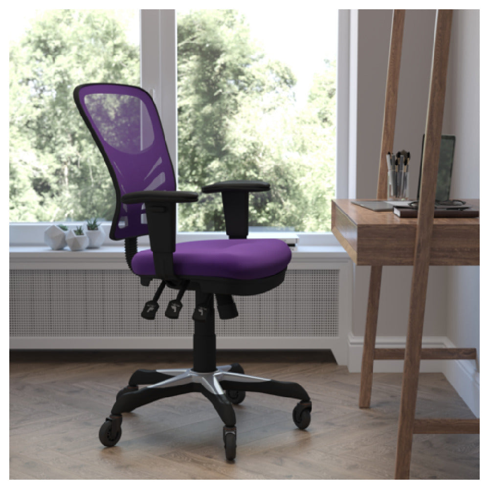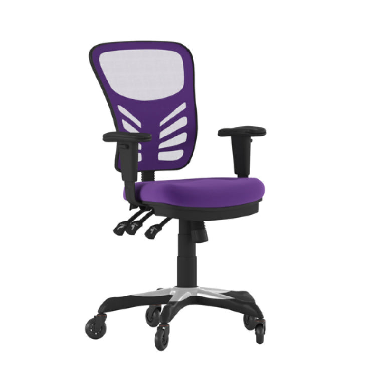 The Flash Furniture HL-0001-PUR-RLB-GG Nicholas Swivel Task Chair is a versatile seating solution designed for various professional environments, featuring an adjustable height range of 37" to 44-1/4". This chair supports a weight capacity of up to 250 lb and is characterized by its mid-back design and mesh back, which promote breathability and comfort during extended use. The padded mesh upholstered seat provides additional comfort, while the built-in lumbar support encourages proper posture. For optimal ergonomic adjustments, the chair includes a triple paddle control mechanism that allows infinite-locking back angle adjustment, a multi-tilt lock mechanism, and a tilt tension adjustment knob. Height adjustable padded arms offer further customization to suit individual preferences. Safety is enhanced with CA117 fire retardant foam, making it suitable for various work settings. The chair's heavy-duty black nylon base is accented with silver details and features ball-bearing poly roller wheels for smooth mobility. Available in a vibrant purple hue, the chair requires assembly upon purchase. Its combination of adjustability, support, and contemporary design makes it an excellent choice for office and home workspaces, providing both functionality and style in a single package.