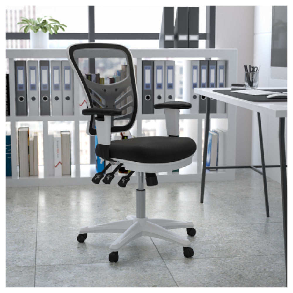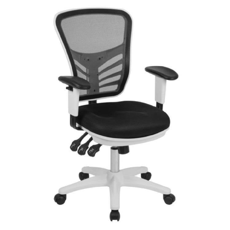 The Flash Furniture HL-0001-WH-BK-GG Nicholas Swivel Task Chair 37" to 44-1/4" Adjustable Height is a versatile seating solution designed to accommodate a range of user needs. Featuring a mid-back design and a weight capacity of 300 lb., this chair is suitable for both office environments and home workspaces. The chair's mesh back and padded mesh upholstered seat provide breathability and comfort, while the built-in lumbar support ensures ergonomic positioning during extended periods of use. Equipped with a triple paddle control mechanism, users can adjust the chair's height, back angle, and tilt tension to their preference, thanks to the infinite-locking back angle adjustment and multi-tilt lock mechanism. The height-adjustable padded arms further enhance the chair's customizability. Safety and durability are prioritized with the inclusion of CA117 fire retardant foam, a heavy-duty nylon base, and dual wheel casters that facilitate smooth movement. The chair's sleek white frame and black mesh finish add a modern aesthetic to any setting. Assembly is required to set up this adaptable and functional task chair, making it an ideal choice for professionals seeking comfort and flexibility in their seating arrangements.