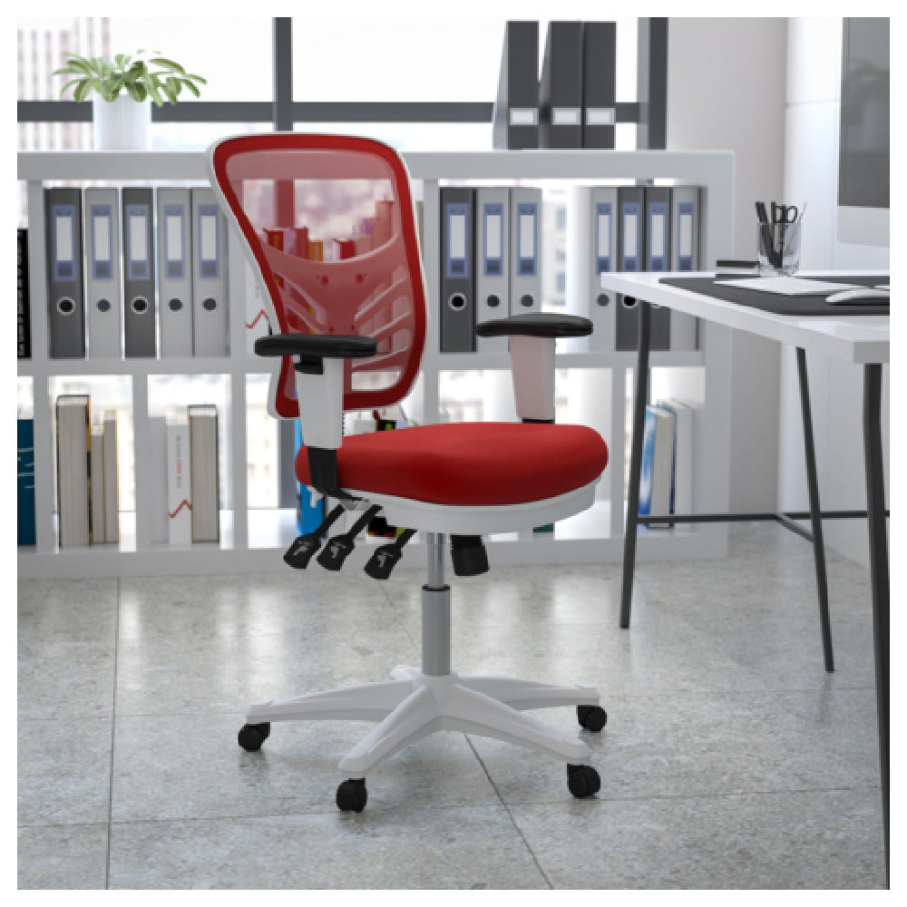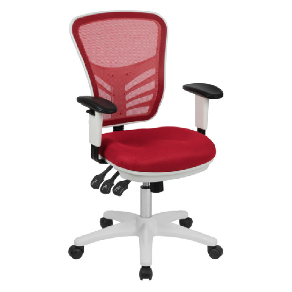 The Flash Furniture HL-0001-WH-RED-GG Nicholas Swivel Task Chair is designed for versatile office environments, offering adjustable features that cater to various user needs. With a height range of 37 to 44-1/4 inches, this chair accommodates different desk heights and user preferences. It supports a weight capacity of up to 300 pounds, ensuring durability and strength for diverse body types. The mid-back design, coupled with a mesh back and padded mesh upholstered seat, provides breathable comfort and ergonomic support. Built-in lumbar support enhances posture, making it ideal for long working hours. The chair is equipped with a triple paddle control mechanism, allowing for precise adjustments. Users can benefit from the infinite-locking back angle adjustment and multi-tilt lock mechanism for finding the perfect seating position. The tilt tension adjustment knob adds further customization to the seating experience. Height adjustable padded arms enhance comfort and adaptability. Safety features include CA117 fire retardant foam, while the heavy-duty nylon base and dual wheel casters ensure stability and smooth mobility. The white frame and red mesh combine style with functionality, making this chair a practical and aesthetic choice for professional office settings.