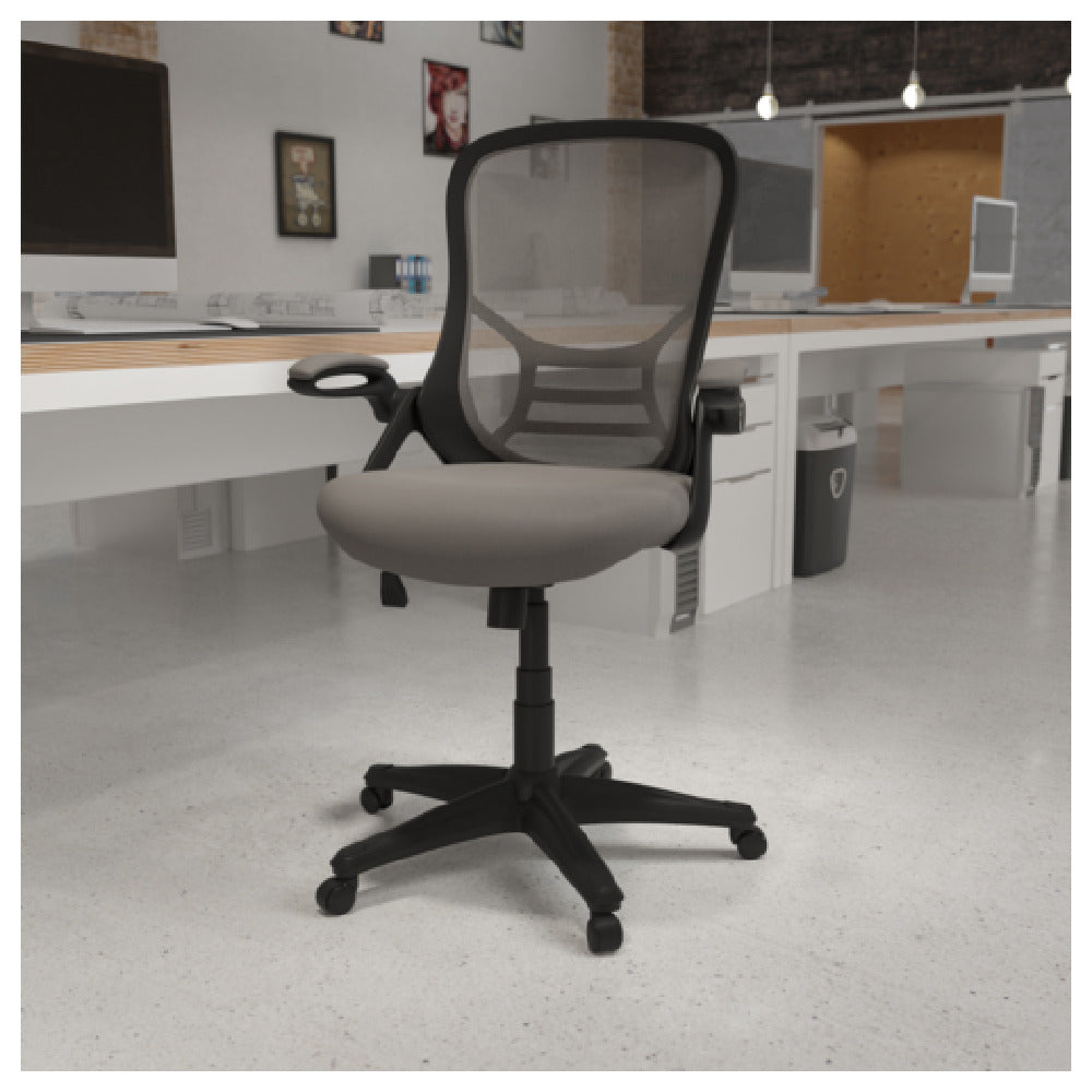 The Flash Furniture HL-0016-1-BK-GY-GG Porter Swivel Office Chair is an ergonomic seating solution designed with versatility and comfort in mind. With an adjustable height range of 40-1/4" to 44", this chair adapts to various desk heights, accommodating users of different statures. Featuring a high back design and a mesh back, it ensures proper ventilation and support during prolonged use. The padded mesh upholstered seat enhances comfort, while the built-in lumbar support promotes healthy posture. A tilt lock mechanism and tilt tension adjustment knob allow for personalized recline settings, making it suitable for office environments requiring flexibility. The chair supports up to 250 lbs, reflecting its robust construction. Flip-up padded arms provide additional comfort and flexibility, allowing users to switch between task-oriented and relaxed postures. The CA117 fire retardant foam ensures safety, meeting industry standards. Supported by a durable nylon base and dual wheel casters, the chair offers stability and smooth mobility across various floor surfaces. Its black frame and light gray mesh add a contemporary aesthetic. Assembly is required, ensuring all components are securely fitted for optimal performance. This chair is a practical choice for home offices, corporate settings, and co-working spaces prioritizing adjustable ergonomic design and functionality.