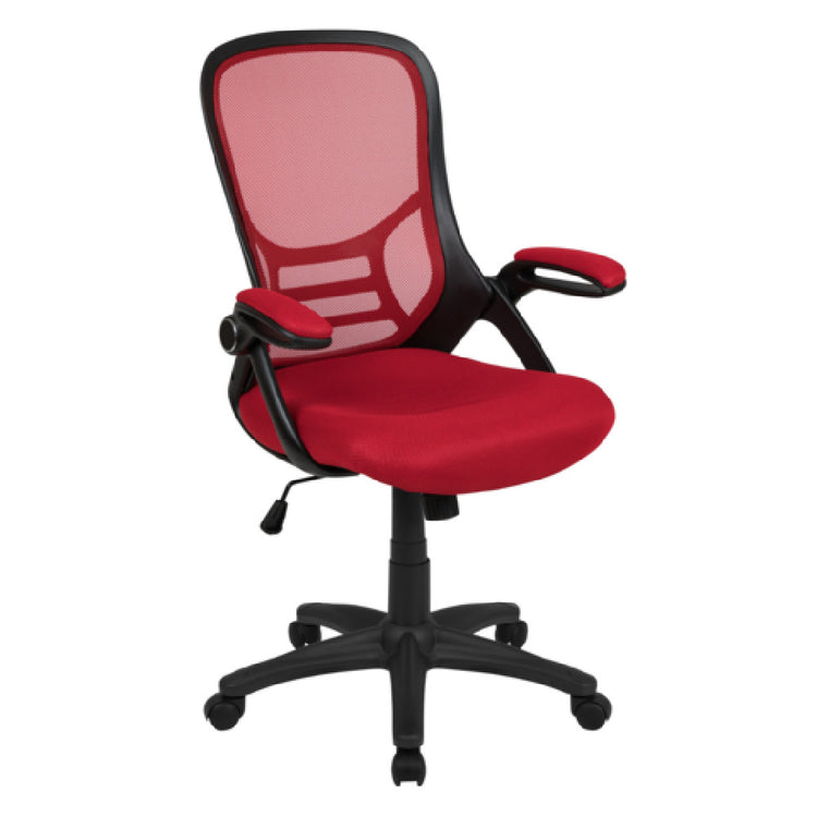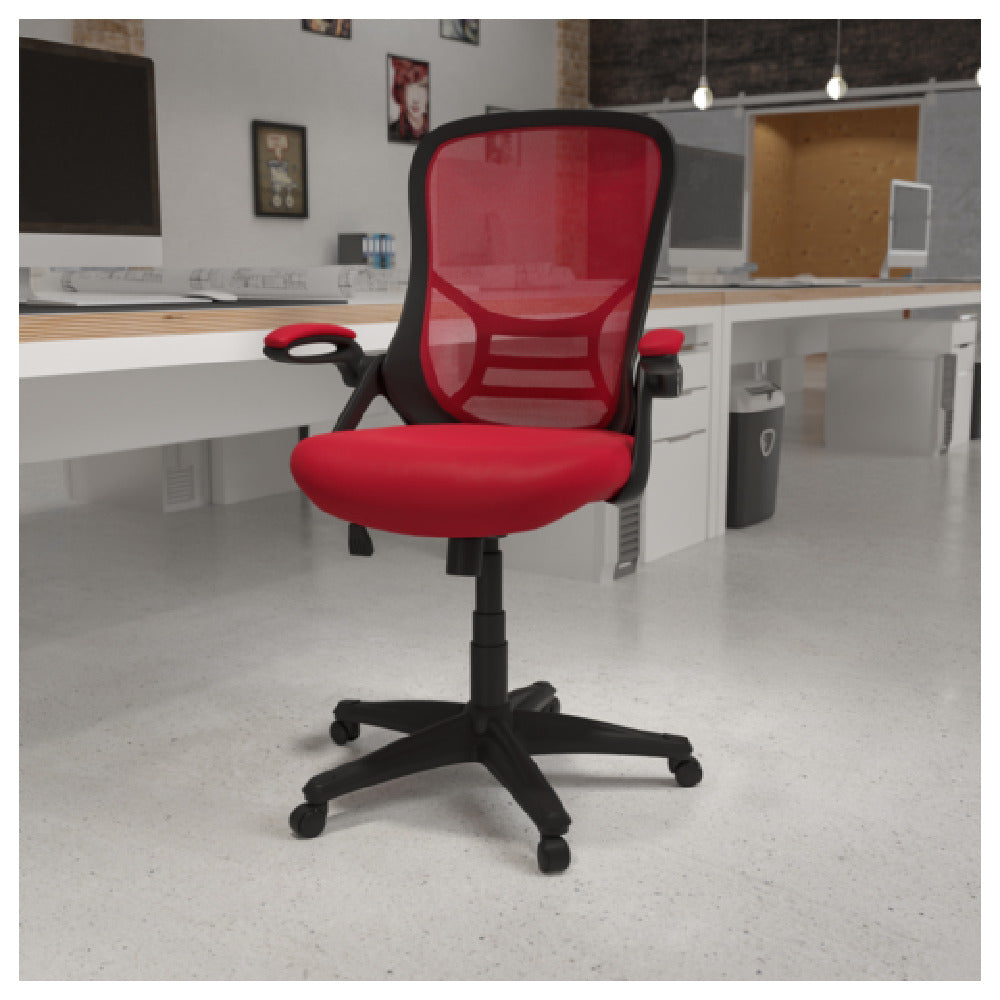 The Flash Furniture HL-0016-1-BK-RED-GG Porter Swivel Office Chair is an ergonomic and versatile seating solution, ideal for diverse professional environments. Featuring an adjustable height range of 40-1/4 inches to 44 inches, this chair accommodates various user preferences and desk heights. It supports a weight capacity of up to 250 pounds, ensuring robust durability. Its high back design, coupled with a mesh back and padded mesh upholstered seat, provides comfort and breathability, making it suitable for prolonged use. The built-in lumbar support promotes healthy posture, while the tilt lock mechanism and tilt tension adjustment knob offer customizable reclining options. For added convenience, the chair includes flip-up padded arms, allowing for flexible armrest positioning. It is constructed with CA117 fire retardant foam, enhancing safety standards in the workplace. The chair's nylon base and dual-wheel casters ensure smooth mobility across different floor surfaces, with a stylish black frame and eye-catching red mesh. Assembly is required, providing users the opportunity to engage with the chair's construction. The Flash Furniture Porter Swivel Office Chair is a valuable asset for offices and home workspaces, combining functionality with a modern aesthetic to meet the demands of various market segments.