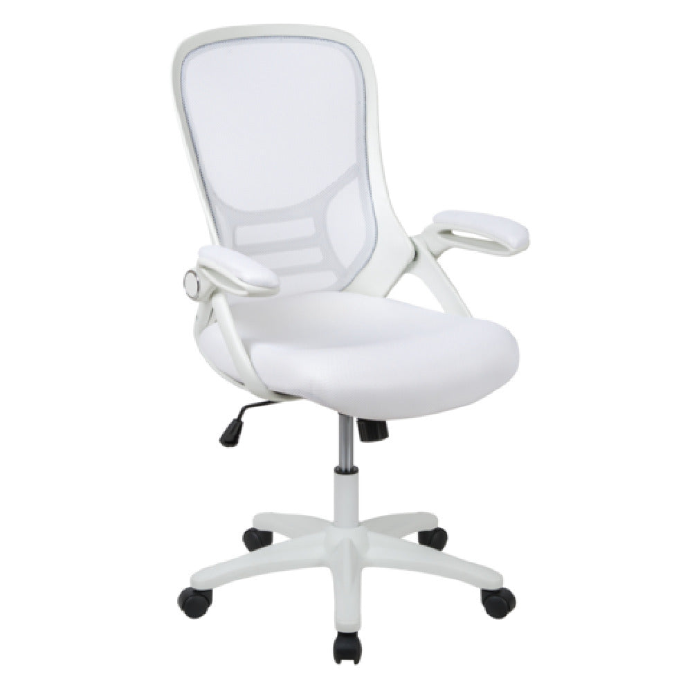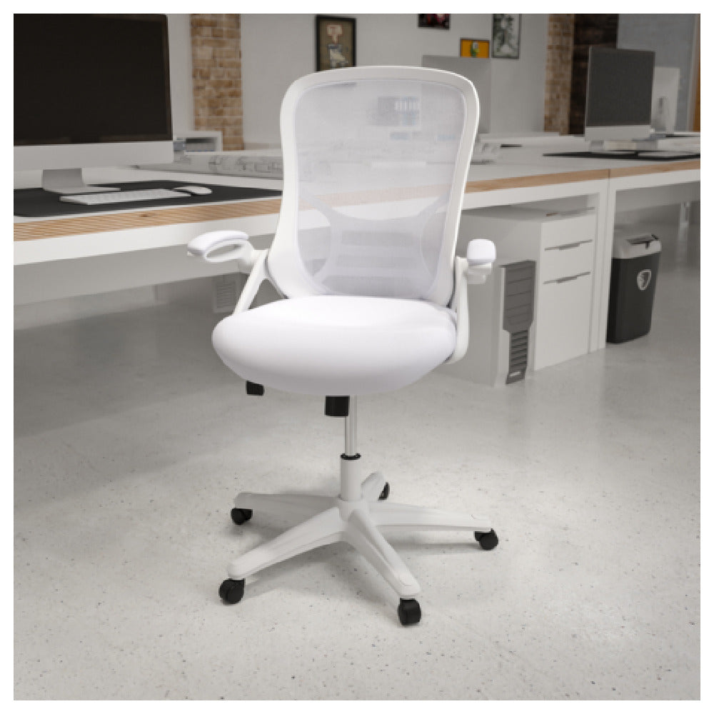 The Flash Furniture HL-0016-1-WH-WH-GG Porter Swivel Office Chair 40-1/4" to 44" Adjustable Height is a versatile and ergonomic seating solution suitable for a variety of professional environments. This chair features a high back design and a breathable mesh back, providing comfort and support during extended work periods. The padded mesh upholstered seat enhances the seating experience, while the built-in lumbar support ensures proper spinal alignment. With a weight capacity of 250 lb., it accommodates a wide range of users. The chair is equipped with a tilt lock mechanism and a tilt tension adjustment knob, allowing users to customize their seating position for optimal comfort and productivity. Additionally, the flip-up padded arms offer flexibility and convenience, particularly in shared workspaces. Constructed with CA117 fire retardant foam, the chair prioritizes safety without compromising on comfort. The nylon base and dual wheel casters provide stability and effortless mobility across various flooring surfaces. Available in white, the chair requires assembly upon delivery. This office chair is designed to meet the diverse needs of different market segments within the office furniture industry, offering a blend of functionality, style, and comfort.