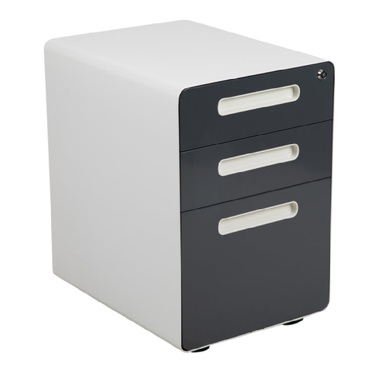 The Flash Furniture HZ-AP535-02-DGY-WH-GG Mobile Drawer Cabinet is a versatile and practical storage solution designed to meet the needs of diverse work environments. Measuring 16"W x 21"D x 24"H, this cabinet is compact yet spacious, featuring a 3-tier drawer system. It includes two utility drawers measuring 13" x 18-3/4" x 4-1/2" and a larger file drawer at 13" x 18-3/4" x 11-1/2", providing ample space for organizing office supplies and important documents. The cabinet enhances security with a lockable upper drawer, making it suitable for safeguarding sensitive items. Equipped with four low profile casters, it ensures effortless mobility, allowing users to reposition it with ease. The inset handles contribute to its sleek design, while the removable pencil tray adds convenience for organizing smaller items. Built with a durable steel frame and a white finish complemented by gray drawers, it offers both durability and aesthetic appeal. This mobile drawer cabinet is ideal for office settings, home workspaces, or educational environments, offering efficient storage without sacrificing style. In-stock items are typically shipped within 24 hours, ensuring quick delivery for immediate organizational needs.