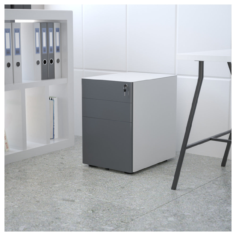 The Flash Furniture HZ-CHPL-02-GRY-WH-GG Mobile Drawer Cabinet 15-1/2"W x 21"D x 22-3/4"H is a versatile and compact storage solution, ideal for professional and personal settings that require organized and mobile filing systems. This cabinet features a 3-tier drawer configuration, which includes two 13" x 18-3/4" x 4-1/2" utility drawers and one 13" x 18-3/4" x 11-1/2" file drawer, catering to diverse storage needs. The lockable upper drawer ensures secure storage of sensitive documents or valuables. Its design includes a robust steel frame with a white finish, complemented by grey drawers, providing a modern aesthetic. The cabinet's mobility is facilitated by four low-profile casters, making it easy to reposition as needed. Side handles enhance maneuverability, while a removable pencil tray offers added organization for smaller items. This cabinet is an excellent choice for offices, educational institutions, and home use, supporting efficient space management and secure storage. The product is conveniently available with quick shipping, as in-stock items typically ship within 24 hours, ensuring timely delivery for immediate organizational needs.