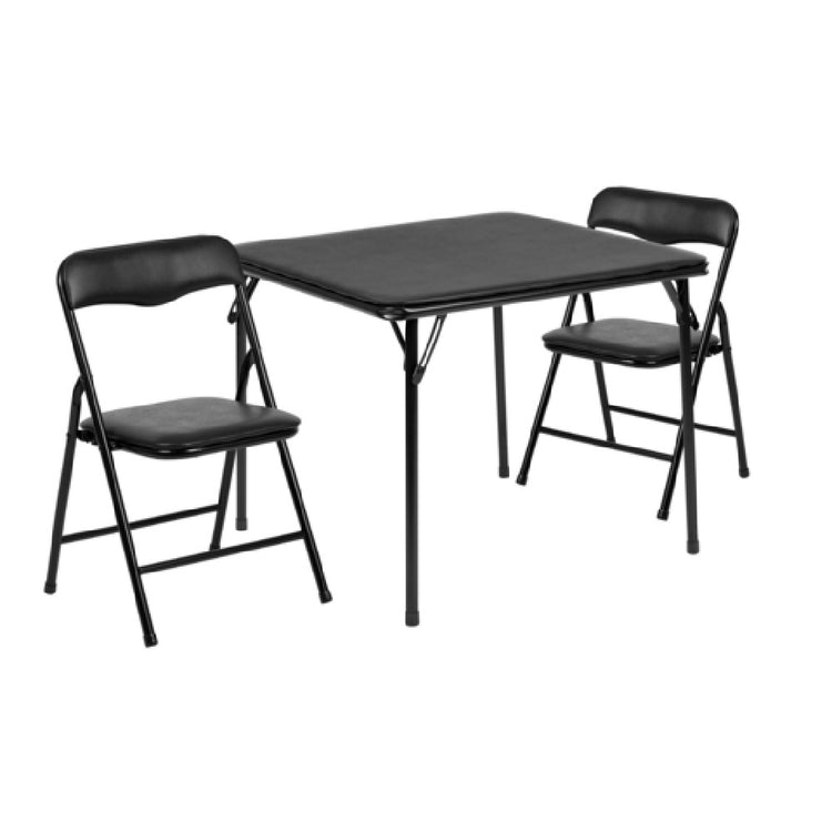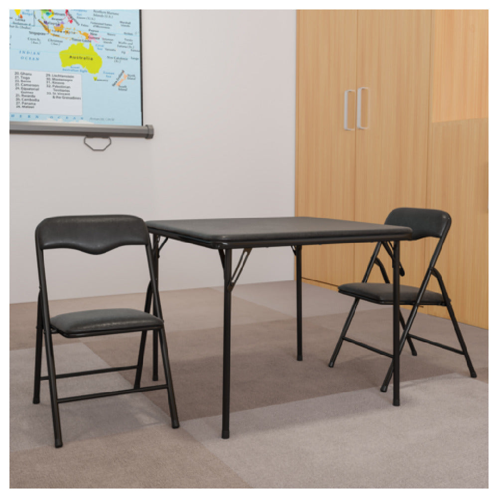 The Flash Furniture JB-10-CARD-BK-GG Mindy Kid's Folding Table and Chair Set is ingeniously designed for versatility and convenience, ideal for various settings such as schools, playrooms, and daycare centers. This set includes a 24"W x 24"D x 20-1/4"H square folding table, which boasts a 70 lb. distributed weight capacity and features a 3/16" thick padded vinyl table top, ensuring durability and easy maintenance. Complementing the table are two folding chairs measuring 12-1/2"W x 13-1/2"D x 21-1/4"H, each capable of supporting up to 81 lb. The chairs are designed with vinyl upholstered seats and backs, ensuring comfort with CA117 sponge foam padding. The powder-coated metal legs provide stability and strength, while plastic floor guides protect surfaces from scratches. The set's compact and foldable nature makes it an excellent choice for environments requiring quick setup and storage solutions. Overall, the Flash Furniture JB-10-CARD-BK-GG Mindy Kid's Folding Table and Chair Set embodies practical design and high-quality materials, perfectly suited for dynamic and educational spaces that prioritize safety and functionality.