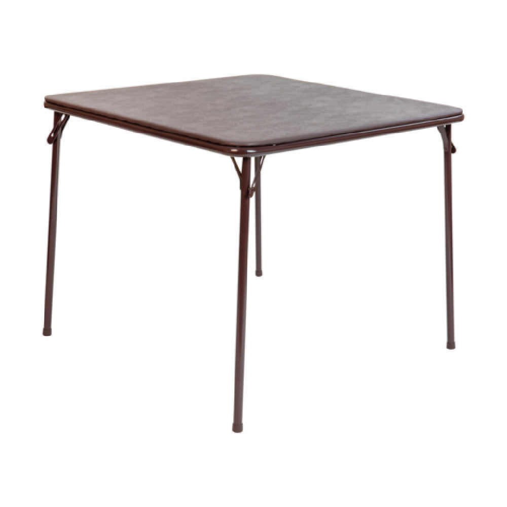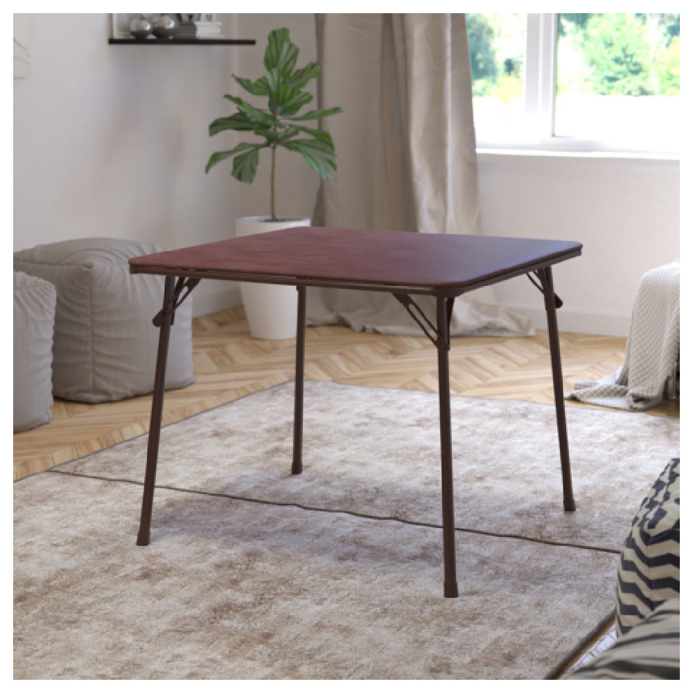 Flash Furniture JB-2-BR-GG Madelyn Folding Card Table - This versatile table measures 33-1/2"W x 33-1/2"D x 27-3/4"H, making it a convenient choice for various settings. With a 130 lb. distributed weight capacity, it is suitable for both casual and professional gatherings. The table features a 3/16" thick padded vinyl tabletop, providing a smooth and cushioned surface ideal for card games or dining. The CA117 sponge foam padding enhances comfort while ensuring safety standards are met. Supported by powder-coated metal legs, this table offers stability and durability for long-term use. Plastic floor glides protect floors from scratches and facilitate easy movement. Designed for both indoor and outdoor use, the Madelyn Folding Card Table adapts effortlessly to different environments, from home entertainment spaces to outdoor patios. The brown finish complements various decor styles, and with items usually shipping within 24 hours, it ensures prompt delivery for your next event or gathering.