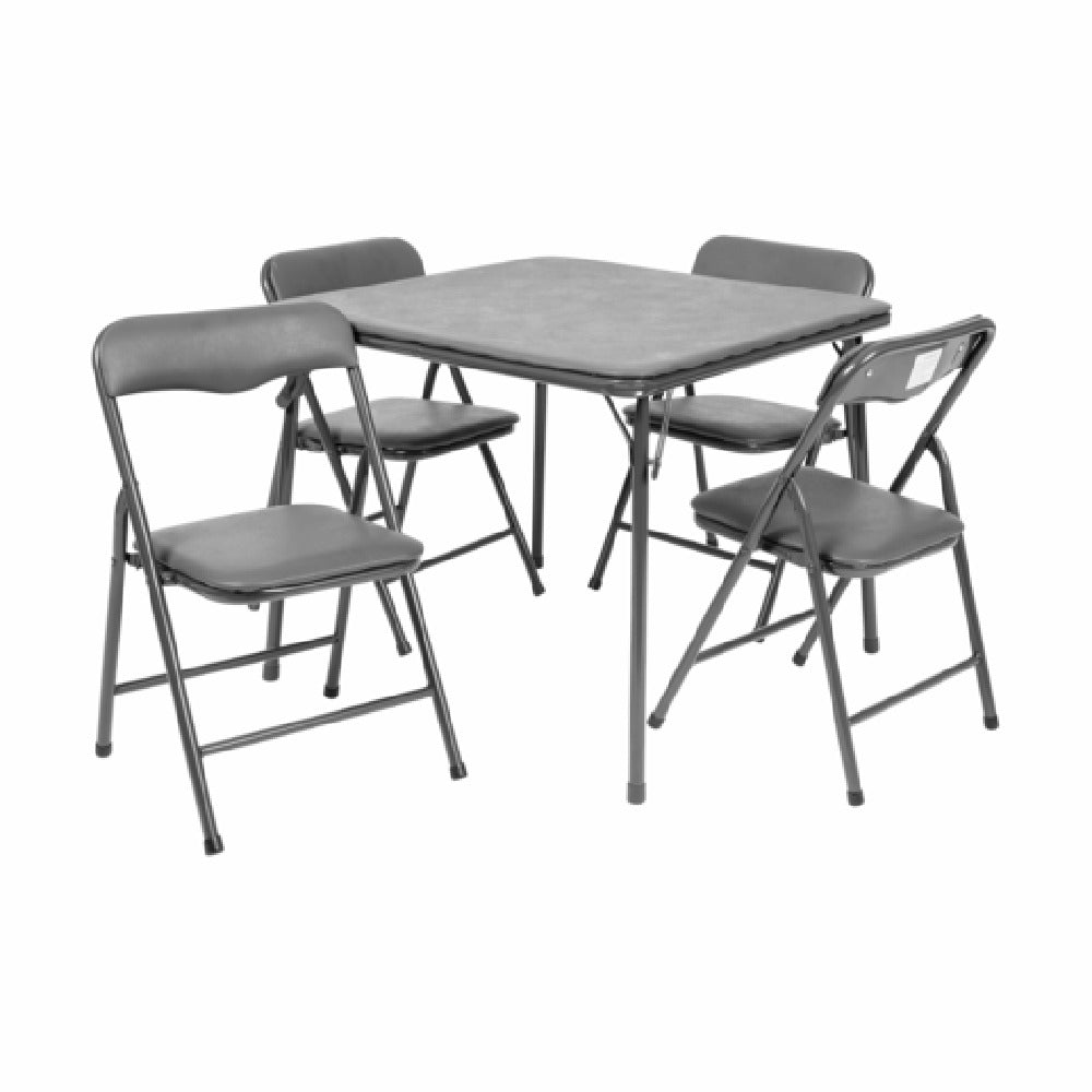The Flash Furniture JB-9-KID-GY-GG Mindy Kid's Folding Table And Chair Set includes a 24"W x 24"D x 20-1/4"H square folding table, designed to accommodate various activities with a 70 lb. distributed weight capacity. The table's 3/16" thick padded vinyl top provides a durable and easy-to-clean surface, suitable for art projects and playtime. Accompanying the table are four folding chairs, each measuring 12-1/2"W x 13-1/2"D x 21-1/4"H and supporting up to 81 lb. The chairs feature vinyl upholstered seats and backs with CA117 sponge foam padding for added comfort. The powder-coated metal legs ensure sturdy support, while plastic floor guides protect your floors and enhance stability. This set's compact design and foldable nature make it ideal for spaces that require flexibility, such as daycare centers, homes, or schools. With its neutral gray color, the set seamlessly fits into different décor styles, and in-stock items generally ship within 24 hours, offering convenience for timely setups. The combination of functionality and space-saving design makes the Flash Furniture Mindy Kid's Folding Table And Chair Set a practical choice for accommodating young ones in various environments.