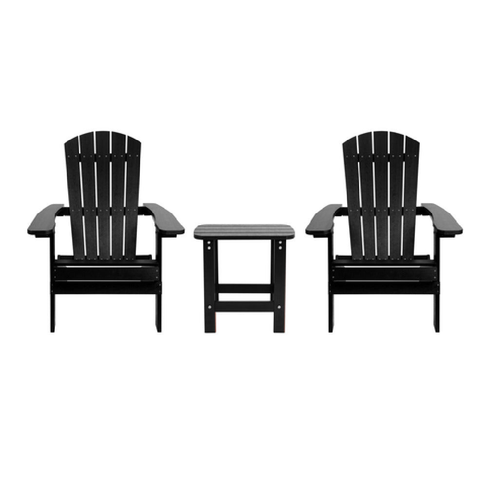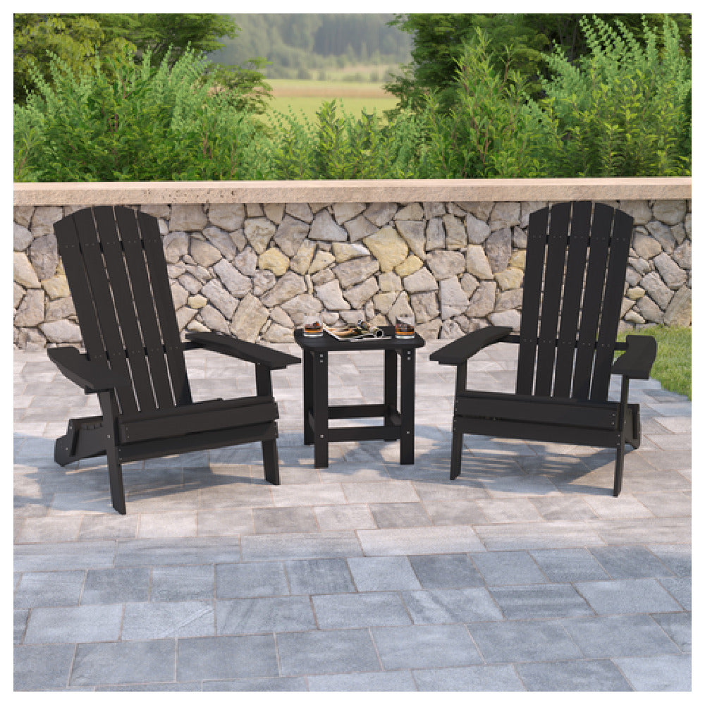 Flash Furniture JJ-C14505-2-T14001-BLK-GG Folding Adirondack Chairs with Side Table is a versatile outdoor furniture set that offers a blend of practicality and style. This set includes two folding Adirondack chairs and one side table, all crafted with a durable poly resin frame in a sleek black finish. The poly resin material is known for its longevity and resistance to environmental elements, making these chairs ideal for various outdoor settings, from residential patios to commercial hospitality venues. The folding feature of the chairs enhances portability and storage convenience, making it a practical choice for spaces with limited storage capabilities. The accompanying side table provides ample space for beverages and accessories, enhancing the comfort and utility of the seating arrangement. This product suits a range of markets, including homeowners looking for stylish yet sturdy outdoor furniture and business owners in the hospitality industry seeking functional and weather-resistant seating options. The black color adds a modern touch, ensuring the set fits seamlessly into various outdoor aesthetics while maintaining its structural integrity and visual appeal.