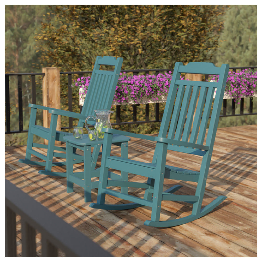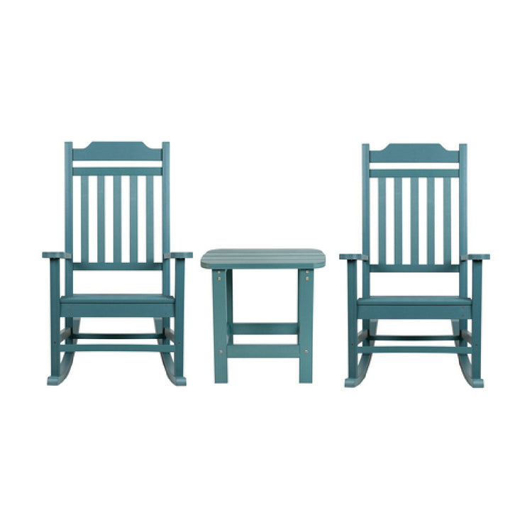 The Flash Furniture JJ-C14703-2-T14001-TL-GG Rocking Chair and Side Table Set is a distinguished choice for those seeking comfort combined with style. This set includes two elegantly designed rocking chairs and one accent side table, each crafted from durable polystyrene faux wood. The vibrant teal color adds a touch of modern flair to any outdoor or indoor setting. With a weight capacity of 225 lb., these chairs offer sturdy support without compromising on the lightweight feel that makes them easy to relocate or rearrange. The polystyrene material mimics the aesthetic appeal of real wood while offering superior resistance to weather and wear, making it ideal for various environments, from patios to cozy living spaces. The inclusion of a side table enhances functionality, providing a convenient spot for drinks, books, or decorative items. This set is particularly appealing to homeowners looking to enhance their outdoor lounging areas, as well as businesses in the hospitality sector aiming to create inviting guest spaces. Its combination of durable materials, practical design, and aesthetic versatility underscores its unique value proposition, catering to both individual and commercial buyers.