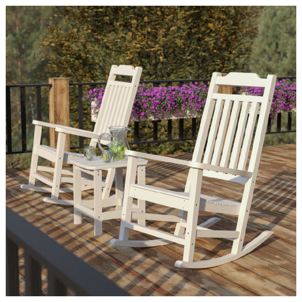 The Flash Furniture JJ-C14703-2-T14001-WH-GG Rocking Chair And Side Table Set is a versatile and stylish addition to any indoor or outdoor setting, designed to accommodate a weight capacity of 225 lb. This elegant set includes two rocking chairs and one accent side table, all crafted from durable polystyrene faux wood in a classic white finish. The set's material choice not only enhances its aesthetic appeal but also ensures longevity and resistance to environmental stressors, making it suitable for various climates and conditions. The rocking chairs provide a perfect blend of comfort and relaxation, ideal for residential spaces like patios and gardens, as well as commercial settings such as cafes and resorts. The accompanying side table offers a convenient surface for holding drinks, books, or decorative items, enhancing the overall functionality of the set. This product is designed to cater to diverse market segments, from homeowners seeking durable and stylish outdoor furniture to hospitality venues aiming to create inviting and comfortable guest areas. With its practical design and sturdy construction, the Flash Furniture JJ-C14703-2-T14001-WH-GG Rocking Chair And Side Table Set delivers both aesthetic appeal and operational efficiency, making it an excellent choice for various applications.