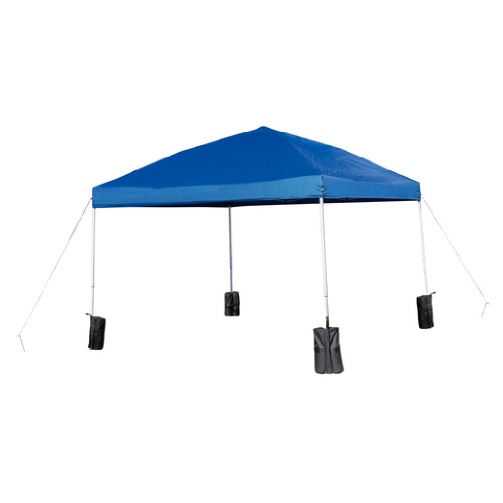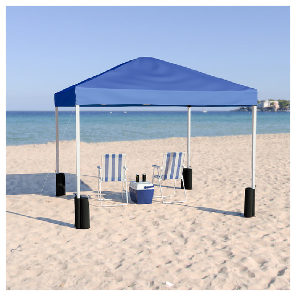 The Flash Furniture JJ-GZ1010PKG-BL-GG Pop-up Canopy Tent 10' x 10' is a versatile shelter solution characterized by its comprehensive feature set, suitable for a variety of outdoor events and activities. This tent includes a wheeled case, ensuring easy transportation and mobility, making it particularly appealing to event coordinators and outdoor enthusiasts. Its dimensions of 10 feet by 10 feet provide a substantial coverage area, ideal for offering shade at gatherings or trade shows. The canopy is both water and UV resistant, providing reliable protection against the elements. The tent’s powder-coated legs enhance durability and resist corrosion, while the adjustable frame height allows customization to suit different needs and environments. This adaptability makes it a practical choice for vendors and exhibitors who require quick setup and takedown. The inclusion of sandbags and ground stakes further supports stability in various weather conditions, ensuring the tent remains securely anchored. The blue color adds a visually appealing touch, making it stand out in crowded spaces. Overall, the Flash Furniture Pop-up Canopy Tent combines portability, durability, and functional design, making it a valuable asset for diverse market segments, including commercial, recreational, and residential users seeking reliable outdoor shelter solutions.
