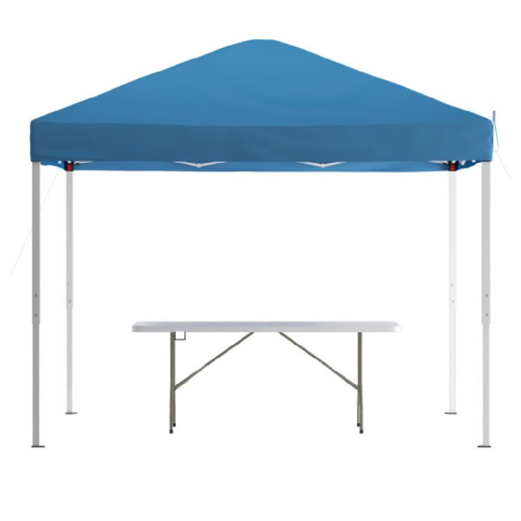 The Flash Furniture JJ-GZ10183Z-BL-GG Otis Pop-up Canopy Tent and Folding Bench Set is a versatile outdoor solution, perfect for various applications across different market segments. This set features a 10-foot by 10-foot blue canopy tent, providing ample coverage and protection from the elements, making it ideal for events, outdoor markets, and recreational use. Its pop-up design ensures a quick and effortless setup, allowing users to focus on their activities rather than the logistics of assembly. Complementing the canopy tent is a 72-inch wide by 30-inch deep by 29-inch high white folding table, which offers a sturdy and portable surface for dining, display, or workspace needs. Both the tent and table are designed for optimum portability, with the canopy tent conveniently packaged in a carry bag, enhancing ease of transport and storage. This product set combines functionality and convenience, catering to event organizers, vendors, and outdoor enthusiasts who require reliable shelter and workspace solutions. Its thoughtful design and practical dimensions ensure that it meets diverse needs while maintaining ease of use, making the Flash Furniture JJ-GZ10183Z-BL-GG Otis Pop-up Canopy Tent and Folding Bench Set a valuable addition to any outdoor setup.