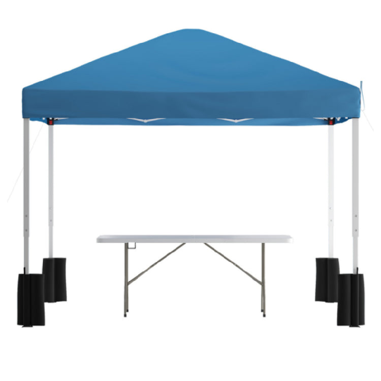 The Flash Furniture JJ-GZ10PKG183Z-BL-GG Otis Pop-up Canopy Tent and Folding Table Set is a versatile and practical accessory, perfect for various outdoor events and activities. This set includes a 10' x 10' blue canopy tent, which provides ample shade and protection from the elements, making it ideal for both commercial and personal use, such as trade shows, outdoor parties, or market stalls. The tent is accompanied by a wheeled carry case, ensuring convenient transportation and storage. To enhance stability, the set comes with four weight bags, a crucial feature for maintaining the tent's position even in windy conditions. Complementing the canopy tent is a 6' white bi-folding table, which includes a carrying handle for effortless mobility and storage. The table's design allows for quick setup and takedown, making it suitable for a range of settings from casual picnics to professional exhibitions. This product caters to diverse market segments by offering a combination of durability, ease of use, and practical accessories, making it an essential choice for those seeking a reliable and adaptable setup for outdoor events.