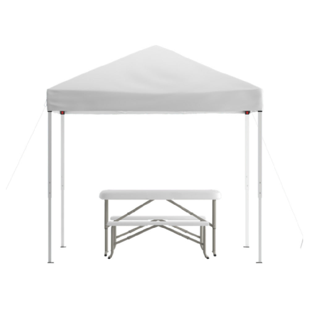 The Flash Furniture JJ-GZ88103-WH-GG Kramer Pop-up Canopy Tent and Folding Table with Bench Set is a versatile outdoor solution that combines functionality with convenience. The set includes an 8' x 8' white canopy tent, complete with a handy carry bag for easy transportation, making it ideal for both personal and professional outdoor events. Complementing the canopy is a 3-1/2' white folding table, providing ample space for dining or display. Additionally, the set features two white folding benches, offering comfortable seating for multiple guests. Designed for quick assembly and disassembly, this set is perfect for markets ranging from casual backyard gatherings to professional outdoor events and exhibitions. The clean, white design ensures a neutral aesthetic that can seamlessly integrate into any setting or theme. With its thoughtful design and practical features, the Flash Furniture Kramer Pop-up Canopy Tent and Folding Table with Bench Set is a valuable addition for those seeking a reliable and stylish outdoor setup. Its portability and ease of use cater to a variety of segment markets, making it a must-have for event planners, caterers, and anyone in need of a comprehensive outdoor furniture solution.