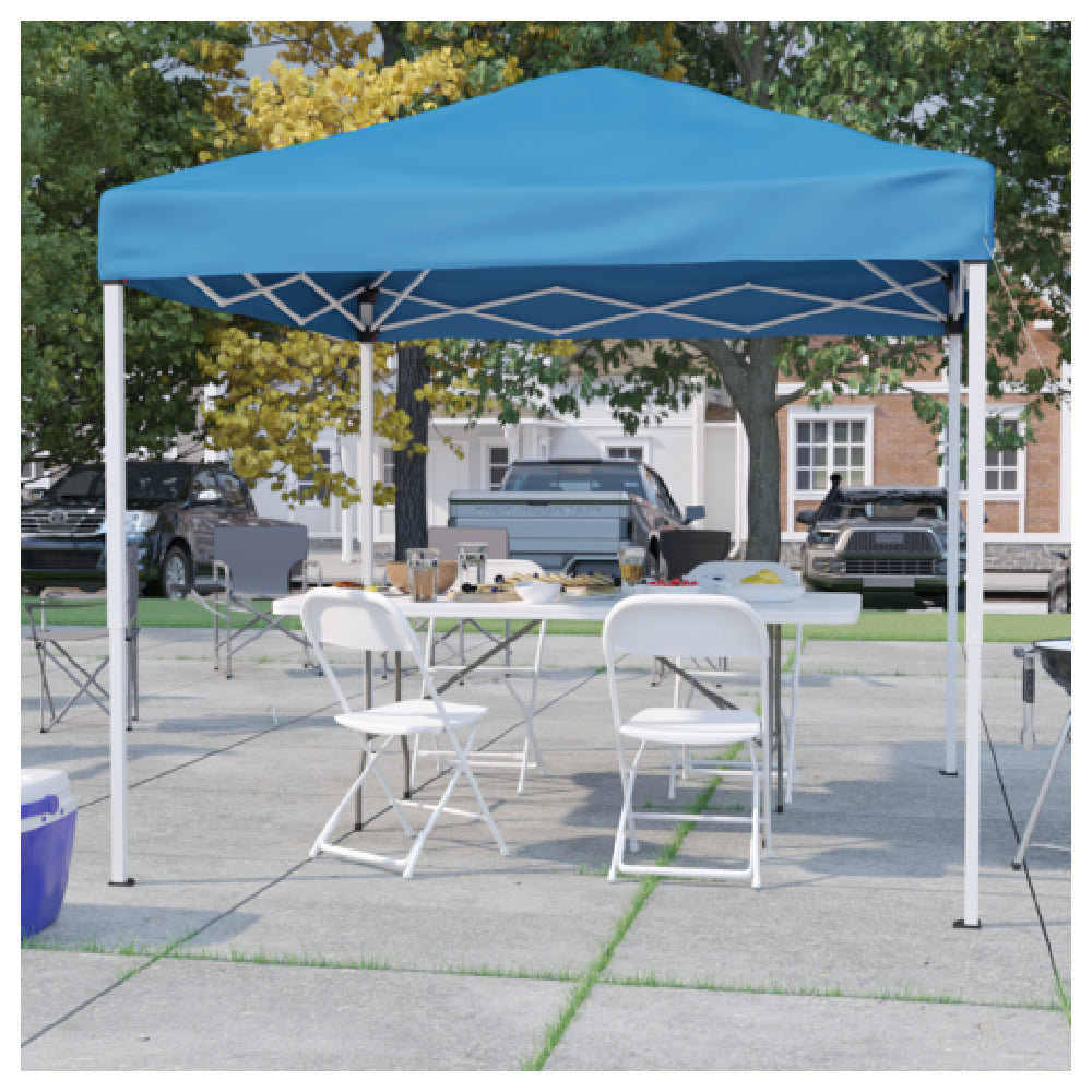 The Flash Furniture JJ-GZ88183Z-4LEL3-BLWH-GG Otis Pop-up Canopy Tent and Folding Table with Chairs Set is a versatile solution for various outdoor activities that demand portability and ease of setup. This comprehensive set includes an 8' x 8' canopy tent, which is coupled with a convenient carrying case for enhanced mobility and storage. The set is tailored for outdoor enthusiasts who require a quick and efficient shelter with accompanying furniture. Additionally, it features a 6' bi-fold table, which comes with a carrying handle, allowing for seamless transportation and setup. The set is completed with four white folding chairs that complement the blue canopy tent, providing a practical and aesthetically pleasing seating arrangement. This product is particularly beneficial for event organizers, caterers, or anyone in need of a temporary setup for outdoor gatherings, fairs, or family picnics. Its lightweight, portable design allows for quick assembly and disassembly, meeting the needs of users who require flexibility and functionality in various environments. The combination of a sturdy canopy and durable furniture pieces makes this set an attractive and practical choice for those aiming to optimize their outdoor space with minimal effort and maximum efficiency.