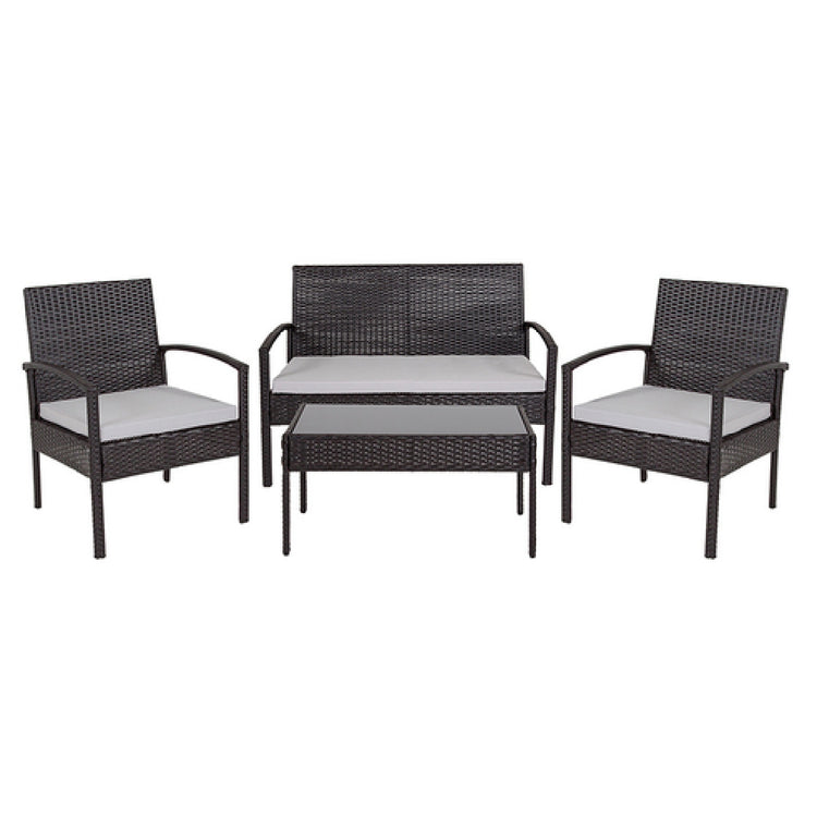 Flash Furniture JJ-S312-GG Outdoor Patio Set 4-piece is an elegantly designed furniture ensemble that caters to outdoor seating needs with precision and style. This set includes two chairs measuring 22-1/2"W x 22"D x 30"H, a spacious 43"W x 22"D x 30"H sofa, and a 29-1/2"W x 16"D x 14-3/4"H coffee table featuring a sleek black tempered glass top. It stands out with its curved arm design and all-weather light gray removable cushion covers, which house dense foam cushions constructed with CA117 fire retardant foam for added safety. The rattan-wrapped finish complements its durable metal frame construction, ensuring longevity and aesthetic appeal. Additionally, the set is equipped with plastic floor glides to protect surfaces from scratches, making it ideal for a variety of outdoor spaces. Assembly is required, and the practical design ensures it remains a popular choice among homeowners and commercial settings, such as cafes or outdoor event venues. With in-stock items typically shipping within 24 hours, the Flash Furniture JJ-S312-GG set promises a blend of functionality and style for diverse outdoor environments.
