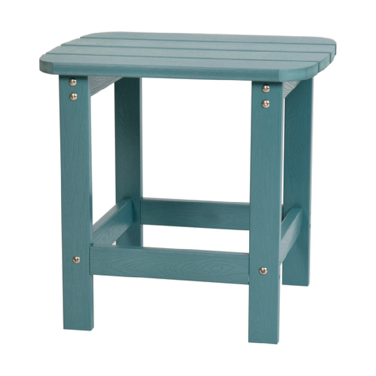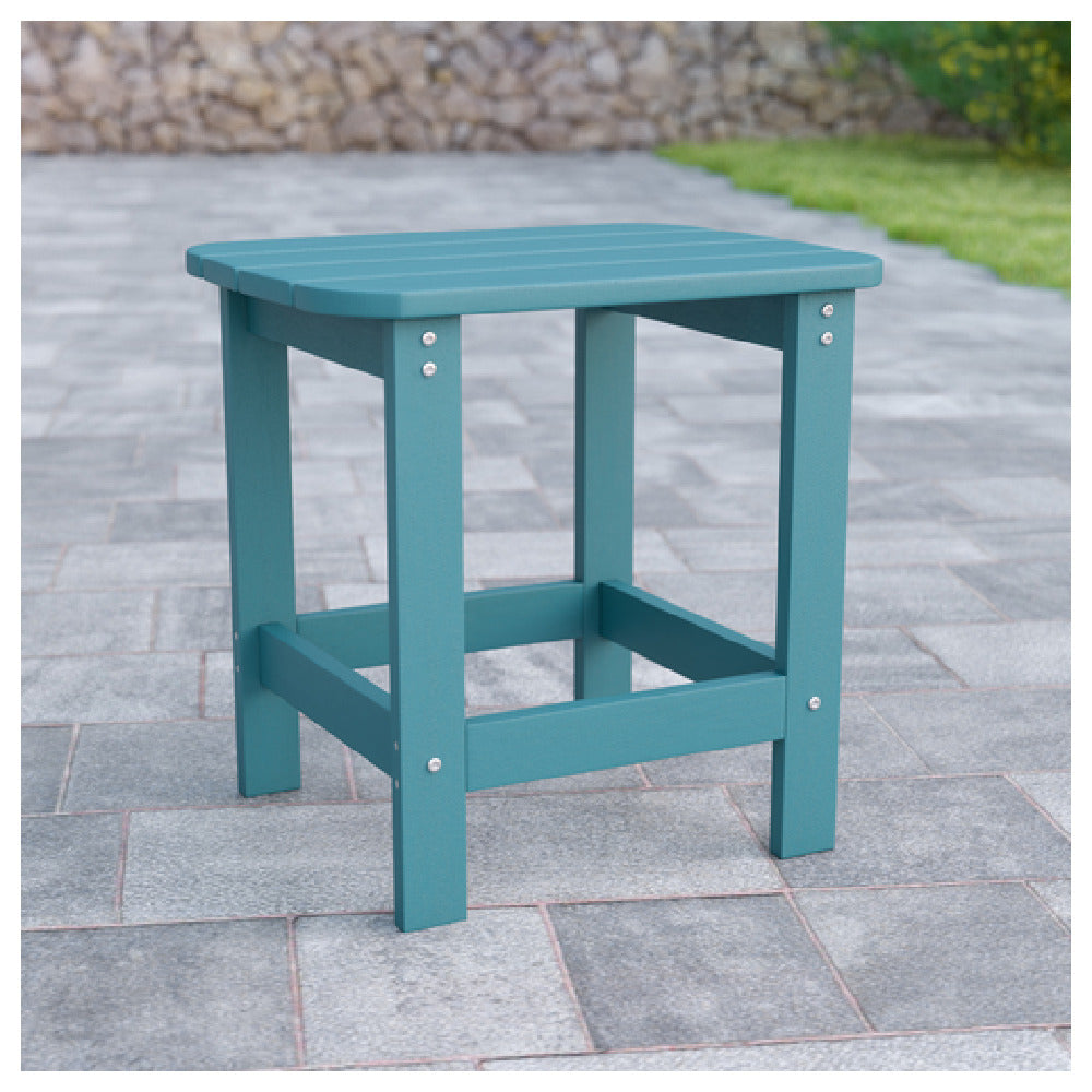 The Flash Furniture JJ-T14001-TL-GG Charlestown Adirondack Side Table is a versatile piece crafted from poly resin wood, embodying both durability and aesthetic appeal. This side table features a unique lattice-style top, adding a touch of elegance to its design. Its vibrant teal color makes it a standout addition to any outdoor setting, perfect for those looking to infuse a pop of color into their décor. The poly resin wood construction ensures the table's resilience against weather elements, making it an ideal choice for outdoor use. The table's dimensions and design are tailored to complement traditional Adirondack chairs, creating a cohesive and inviting outdoor living space. This product appeals to a wide range of consumer segments, from homeowners seeking durable outdoor furniture to commercial spaces like resorts and hotels that require stylish and long-lasting furnishings. The Flash Furniture JJ-T14001-TL-GG side table is not only functional but also serves as a decorative piece, enhancing the ambiance of patios, gardens, or poolside areas. Its robust construction and thoughtful design make it a reliable choice for those prioritizing both style and practicality in their outdoor furniture selections.