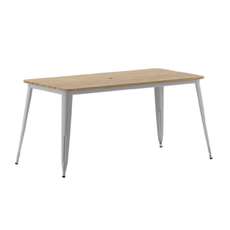 The Flash Furniture JJ-T146120-BRSL-GG Declan Dining Table is a versatile 60"W x 30"D x 30"H rectangular table, designed for both indoor and outdoor environments. It boasts a sturdy poly resin table top, supported by a powder-coated steel frame and stainless steel hardware, ensuring longevity and resistance to the elements. This dining table features an impressive weight capacity of 500 lbs, accommodating various dining setups and gatherings. A practical umbrella hole allows for seamless integration of a sunshade, enhancing its usability in outdoor settings. The table is equipped with adjustable floor glides, providing stability on uneven surfaces and safeguarding your floors from potential damage. With its brown and silver color scheme, the Declan Dining Table complements diverse decor styles, from contemporary to rustic. It is well-suited for a variety of markets, including residential homes seeking durable outdoor furniture, commercial settings requiring reliable outdoor dining solutions, and event spaces in need of adaptable and robust furniture options. This table combines practicality with a refined aesthetic, making it a valuable addition to any setting.
