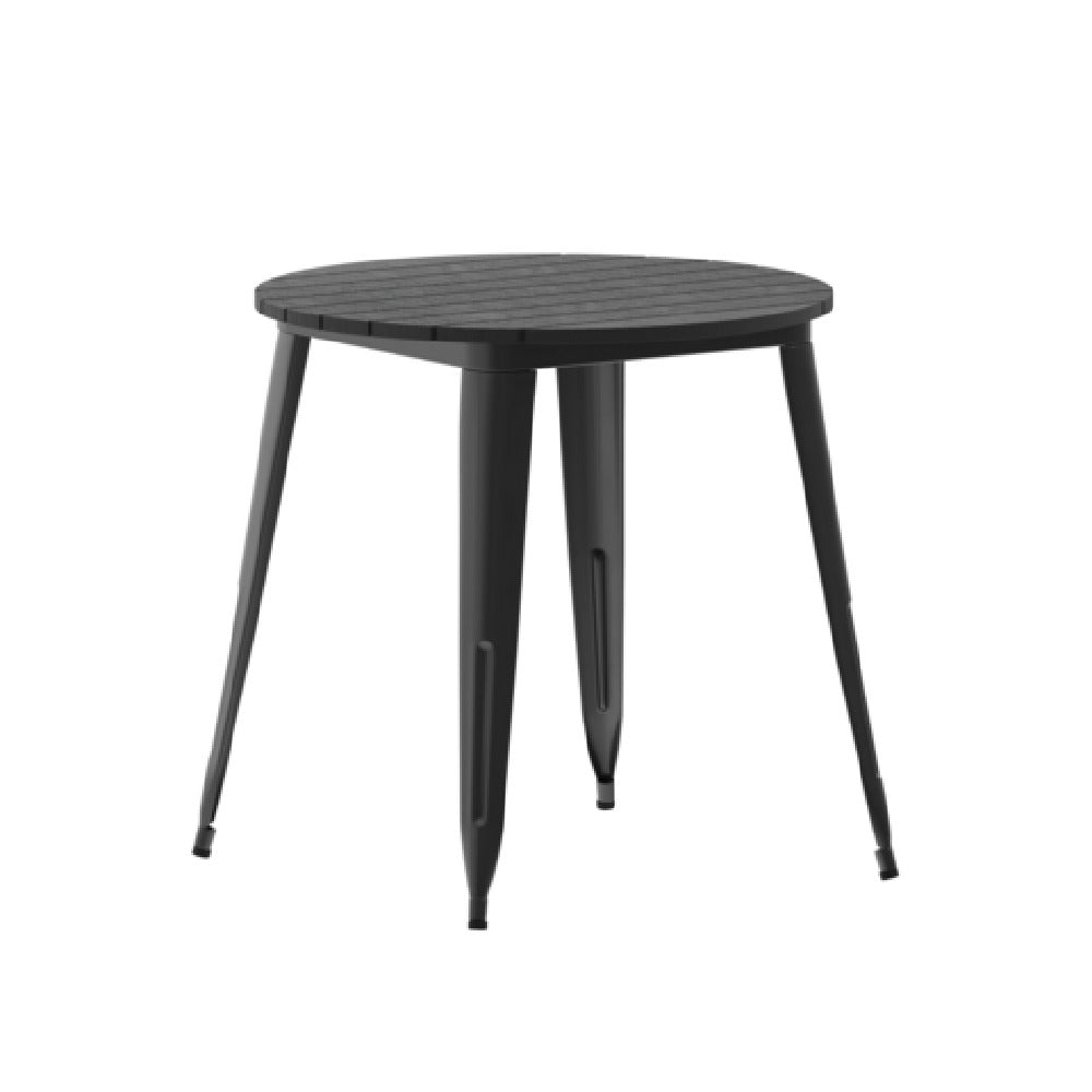 The Flash Furniture JJ-T14623-80-BKBK-GG Declan Dining Table is a versatile piece, ideal for a variety of indoor and outdoor settings. This round table measures 30 inches in diameter and stands 30 inches tall, providing a compact yet functional solution for dining spaces. With a weight capacity of 200 pounds, it is suitable for accommodating a range of dining essentials or decorative items. The table's poly resin top ensures durability, making it resistant to daily wear and tear. Complementing this is a powder-coated steel frame that enhances its sturdiness, while stainless steel hardware offers additional resilience against the elements. The table is equipped with adjustable floor glides, allowing for stability on uneven surfaces, which is particularly beneficial in outdoor environments. Available in a sleek black finish, the Declan Dining Table seamlessly integrates with various decor styles, from modern to minimalist. Its combination of materials and design features makes it a compelling choice for both residential and commercial use, whether in a cozy home dining area or a stylish café patio. This product stands out in the market for its balance of aesthetic appeal, durability, and functionality, catering to diverse needs within the furniture industry.