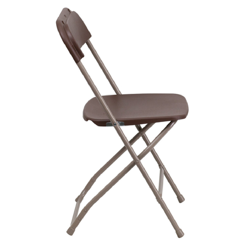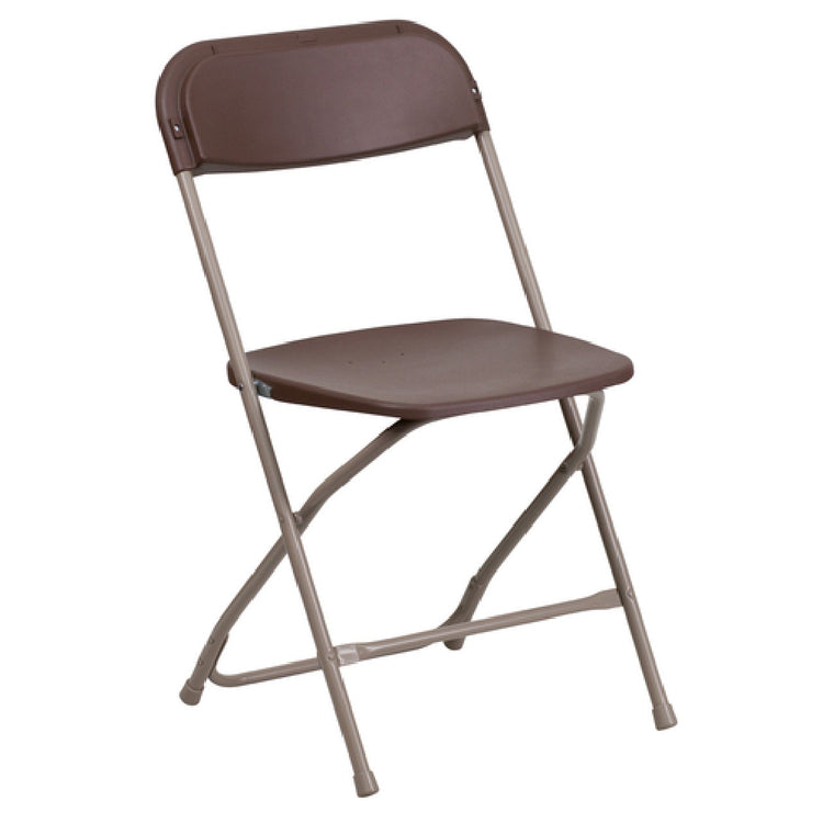 The Flash Furniture LE-L-3-BROWN-GG Hercules Series Premium Folding Chair is engineered to provide exceptional strength and durability with a remarkable 650 lb. weight capacity, making it suitable for a wide range of commercial applications. This lightweight chair features a contoured plastic back and seat for enhanced comfort, along with a textured seat design that includes drain holes, ensuring quick drying and ease of maintenance. The chair is built with double support rails and an 18-gauge steel frame, offering robust stability and reliability. Finished with a brown powder coating, the frame not only provides a sleek appearance but also adds an extra layer of protection against wear and tear. The non-marring floor caps safeguard flooring surfaces from scuffs and damage, making this chair an ideal choice for both indoor and outdoor use. Its space-saving, nesting design facilitates efficient storage, a valuable feature for venues with limited space. Available in brown, the Flash Furniture LE-L-3-BROWN-GG Hercules Series Premium Folding Chair is typically ready for shipment within 24 hours, ensuring quick availability for urgent needs. This chair's combination of strength, practicality, and versatility makes it an excellent option for various market segments within the hospitality and event management industries.