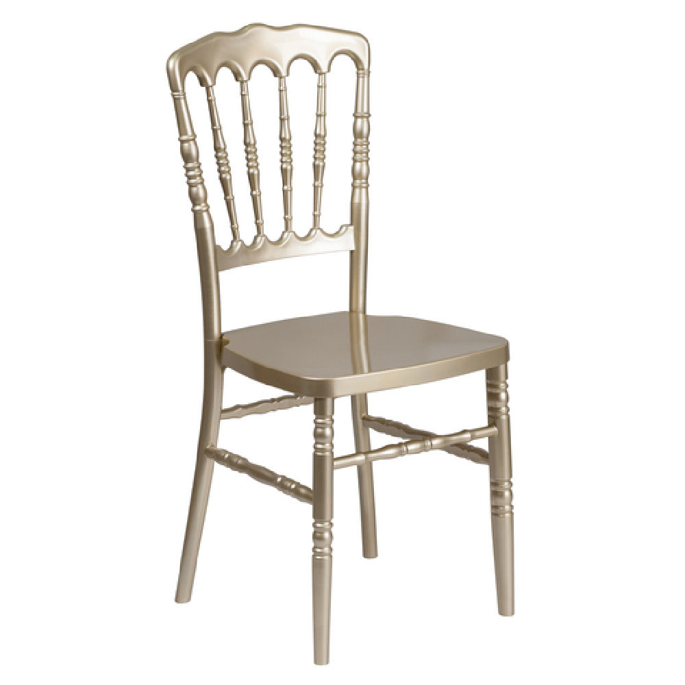 The Flash Furniture LE-L-MON-GD-GG Hercules Series Stacking Napoleon Chair is a robust and versatile seating solution, designed to meet the demands of various environments with its impressive 800 lb. capacity. Featuring a classic spindle back design, this chair combines elegance with functionality. One of its standout attributes is its ability to stack up to 10 chairs high, maximizing storage efficiency and space utilization, making it ideal for venues that require frequent setup and takedown such as event halls, banquet facilities, and conference centers. Constructed from lightweight polypropylene, the chair is easy to move and handle, yet it boasts remarkable durability. Its gold finish adds a touch of sophistication, enhancing the aesthetic appeal in both indoor and outdoor commercial settings. The chair is UV treated and waterproof, ensuring it withstands exposure to the elements and retains its quality over time. This makes it highly suitable for outdoor events and settings such as garden parties or poolside gatherings. In-stock items are usually shipped within 24 hours, ensuring prompt availability for urgent needs. The Flash Furniture Hercules Series Chair is a practical choice for businesses that require reliable, durable seating with a touch of elegance.
