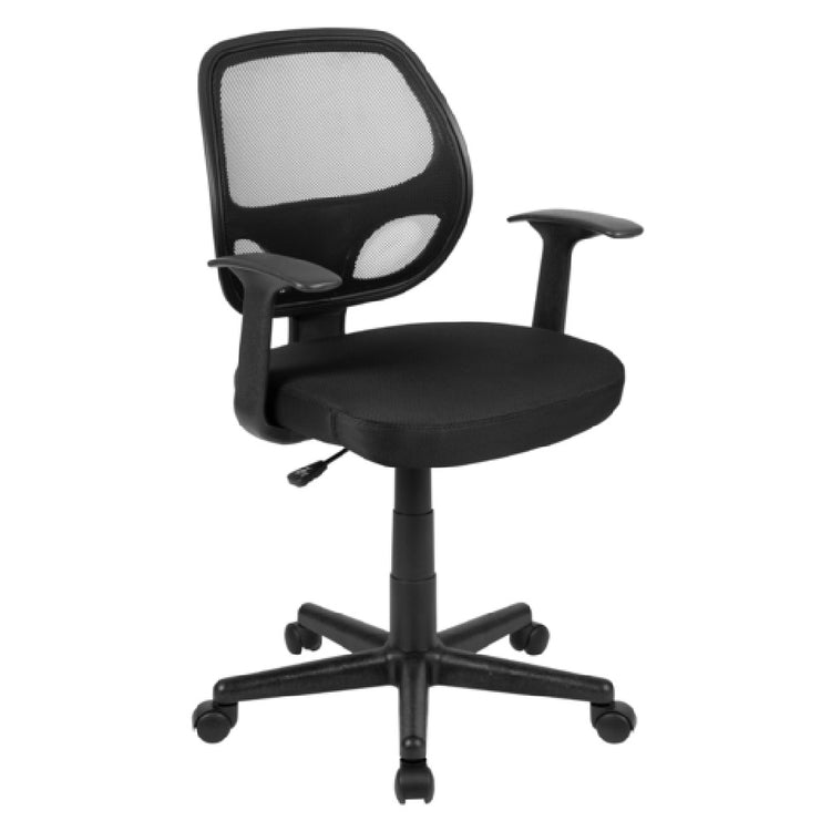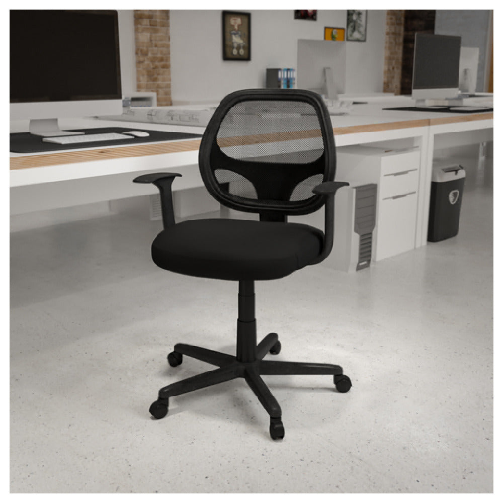 The Flash Furniture LF-118P-T-BK-GG Flash Fundamentals Task Office Chair is meticulously designed to meet the diverse needs of modern workspaces. This chair features a mid-back design that provides optimal support, coupled with a breathable mesh back to enhance comfort and airflow during prolonged use. The seat is padded with mesh upholstery, ensuring a comfortable seating experience while maintaining a sleek appearance. Built to accommodate a wide range of users, the chair boasts an adjustable seat height from 17" to 21-1/2", catering to various desk heights and user preferences. It supports a weight capacity of up to 250 lbs, making it robust and versatile for different body types. The chair is equipped with T-arms for added comfort and a swivel seat for effortless mobility. Its pneumatic seat height adjustment allows for smooth and easy customization to individual needs. Constructed with a durable nylon base and dual wheel casters, this chair ensures stability and ease of movement across different floor surfaces. Additionally, it includes CA117 fire retardant foam, addressing safety concerns. Available in classic black, this task chair requires assembly and is designed to seamlessly fit into various professional settings, offering a blend of functionality and style.