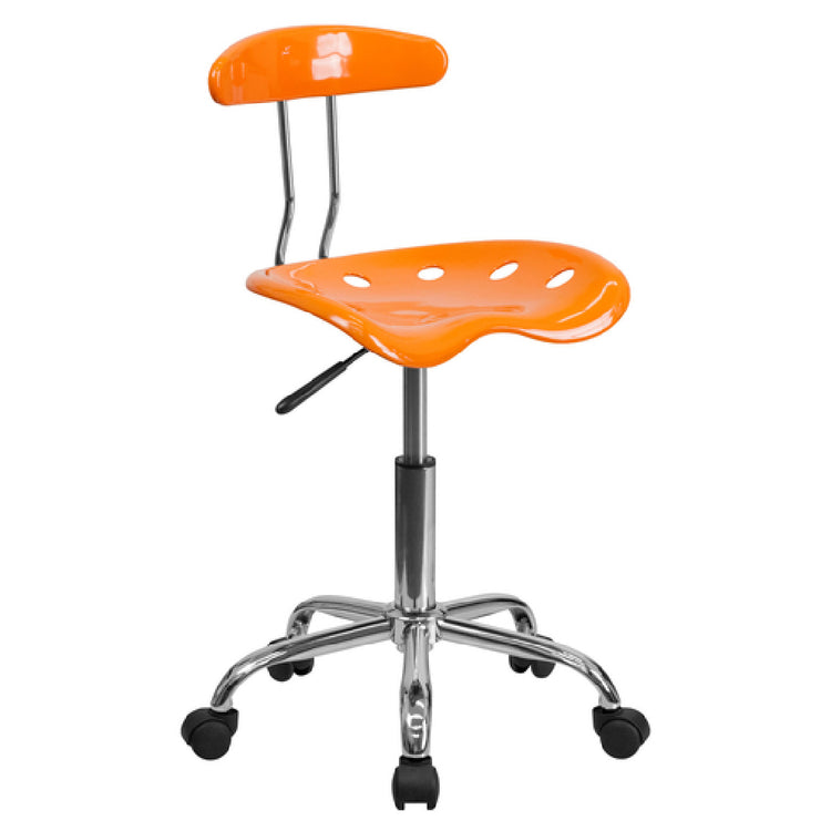 The Flash Furniture LF-214-ORANGEYELLOW-GG Vibrant Swivel Task Chair is an ideal seating solution for a variety of environments, emphasizing comfort and style with its distinct orange-yellow color. This chair's adjustable height spans from 29-1/4 inches to 34-3/4 inches, ensuring tailored comfort for users of different statures. Engineered to support a weight capacity of up to 250 pounds, it combines durability with elegance. The chair features a comfort-molded "tractor" seat crafted from high-density polymer, providing both ergonomic support and a modern aesthetic. Its heavy-duty chrome base offers stability and longevity, while dual-wheel carpet casters ensure easy mobility across floor surfaces. This product is designed for residential use and requires assembly, with items in stock typically shipping within 24 hours. By combining functional design with vivid color, the Flash Furniture LF-214-ORANGEYELLOW-GG Vibrant Swivel Task Chair caters to home offices and creative workspaces, where comfort and visual appeal are equally valued.
