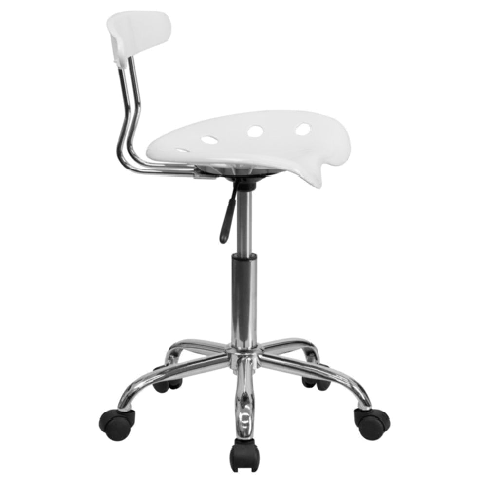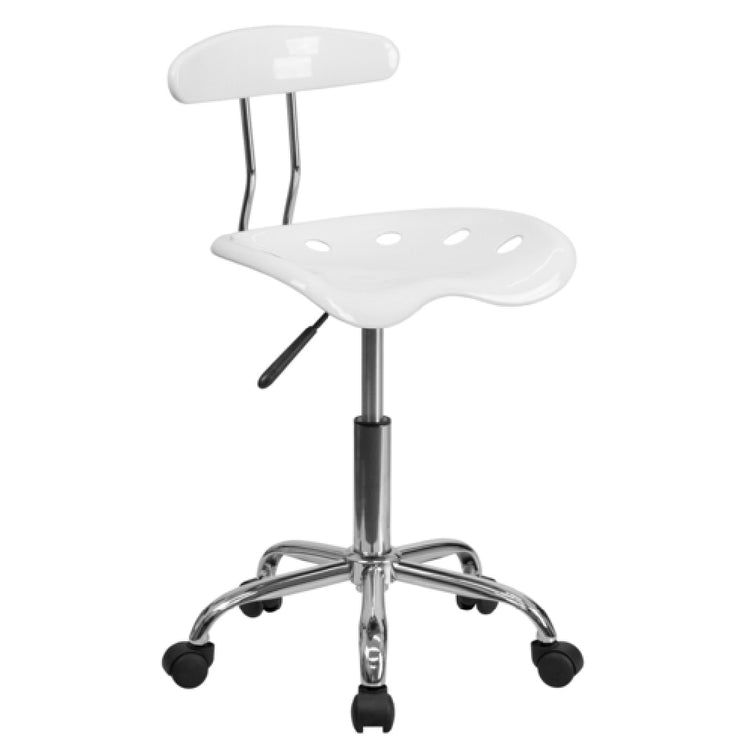 The Flash Furniture LF-214-WHITE-GG Vibrant Swivel Task Chair is a versatile seating solution designed for comfort and functionality in various professional settings. With an adjustable height range of 29-1/4" to 34-3/4", this chair can be customized to suit users of different heights, enhancing ergonomic benefits. It boasts a weight capacity of 250 lb., accommodating a wide range of body types. The chair features a comfort-molded "tractor" seat, providing a unique design that supports long periods of use. Constructed from high-density polymer, it ensures durability and ease of maintenance. The heavy-duty chrome base not only adds a sleek, modern look but also guarantees stability. Equipped with dual-wheel carpet casters, it offers smooth mobility across various floor surfaces. Its white finish makes it suitable for residential use, seamlessly blending into home office environments. Assembly is required, and in-stock items are typically shipped within 24 hours, ensuring quick delivery. This task chair caters to different market segments by providing a combination of style, comfort, and practicality, making it an ideal choice for home offices, study rooms, or any workspace where adaptability and design are valued.