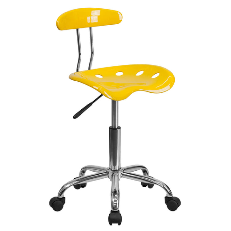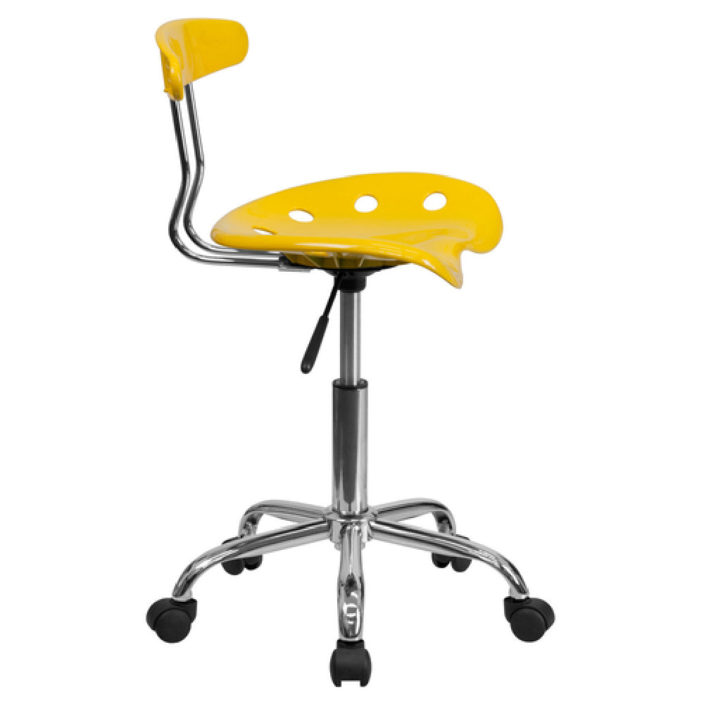 The Flash Furniture LF-214-YELLOW-GG Vibrant Swivel Task Chair is a versatile seating solution designed for both style and function. With an adjustable height ranging from 29-1/4 inches to 34-3/4 inches, this chair accommodates users of varying sizes and preferences, making it suitable for diverse work environments. It boasts a comfort molded "tractor" seat made from high-density polymer, ensuring both durability and ergonomic support for extended use. The chair's heavy-duty chrome base provides a sturdy foundation and is equipped with dual-wheel carpet casters, facilitating smooth mobility across carpeted surfaces. Designed for residential use, the LF-214-YELLOW-GG supports a weight capacity of up to 250 pounds, making it a reliable choice for home offices or study areas. The vibrant yellow-orange color adds a splash of modern flair to any room. Assembly is required, but in-stock items typically ship within 24 hours, ensuring prompt delivery. This task chair is an excellent option for those seeking a blend of vibrant aesthetics, practicality, and comfort in their seating solutions.