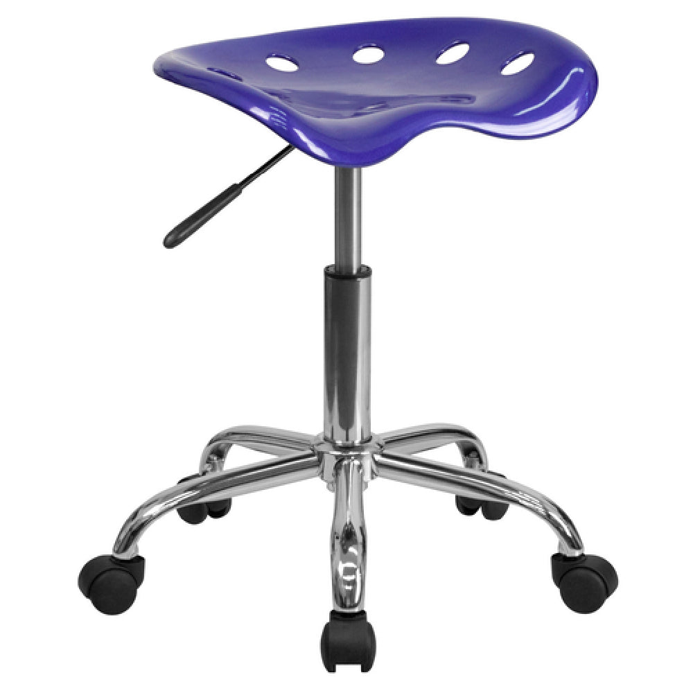The Flash Furniture LF-214A-DEEPBLUE-GG Vibrant Stool 20-1/4" to 25-3/4" Adjustable Height is a versatile seating solution designed for residential environments, blending functionality with a striking aesthetic. This stool features a comfort molded "tractor" seat, crafted from high-density polymer, offering not only durability but also a unique ergonomic design that supports extended use. Its adjustable height, ranging from 20-1/4" to 25-3/4", accommodates various user preferences and tasks. The sturdy chrome frame and base ensure stability and a modern look, while the dual wheel carpet casters provide smooth mobility across different floor surfaces. With a weight capacity of 250 lbs, this stool caters to a wide range of users, making it suitable for diverse household settings, from home offices to creative workspaces. Available in a deep blue color, it adds a vibrant touch to any room. Assembly is required, and items typically ship within 24 hours when in stock, ensuring a quick addition to your home furnishings. This stool's combination of adjustable height, robust construction, and eye-catching design makes it a valuable addition to any residential space seeking both style and function.