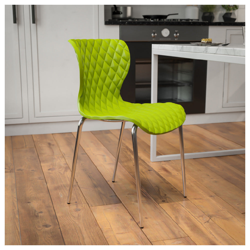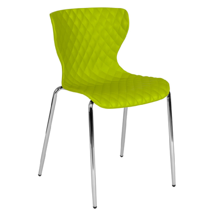 The Flash Furniture LF-7-07C-CGRN-GG Lowell Chair is a versatile seating solution distinguished by its stacking capability and robust construction, supporting a weight capacity of 265 pounds. Its design features a plastic back and seat, contributing to a lightweight yet durable build, ideal for various environments. The chair's aesthetic appeal is enhanced by a sleek chrome frame finish, which not only provides a modern look but also ensures structural integrity and long-lasting performance. The vibrant citrus green color of the seat and back adds a pop of color to any setting, making it suitable for both casual and professional spaces. This chair is particularly beneficial for institutions requiring efficient storage solutions, as its stackable nature allows for space-saving when not in use. The Flash Furniture Lowell Chair is a practical choice for conference rooms, training spaces, and even cafeterias, where flexibility, ease of maintenance, and comfort are paramount. Its combination of style, durability, and practicality makes it a standout option in the market for high-capacity stackable seating.