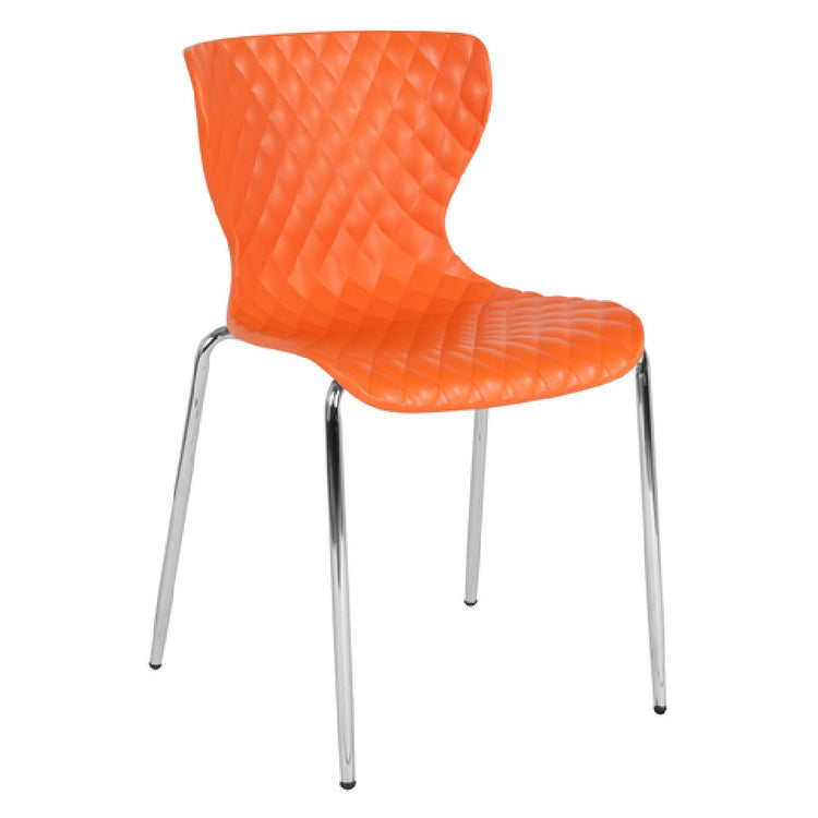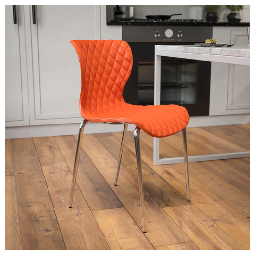 The Flash Furniture LF-7-07C-ORNG-GG Lowell Chair is a versatile and practical seating solution suitable for various environments, including educational institutions, conference rooms, and casual office settings. This chair features a stacking capability that makes it easy to store and organize multiple units efficiently, catering to spaces with dynamic seating needs. With a weight capacity of 265 pounds, it accommodates a wide range of users, ensuring durability and reliability. The chair is designed with a plastic back and seat, providing comfort and ease of maintenance, while the chrome frame finish adds a touch of modern elegance and enhances its durability. The vibrant orange color of the chair makes it an excellent choice for spaces looking to add a pop of color and contemporary style. These features collectively contribute to the chair's unique value proposition, offering a blend of style, functionality, and long-lasting performance. Whether used in a bustling conference room or a vibrant classroom, the Flash Furniture LF-7-07C-ORNG-GG Lowell Chair stands out as a practical and stylish seating option that meets the diverse needs of various market segments within the industry. Its thoughtful design and robust specifications make it a reliable choice for professionals seeking quality seating solutions.