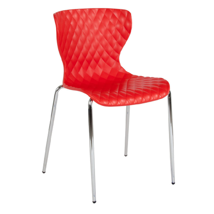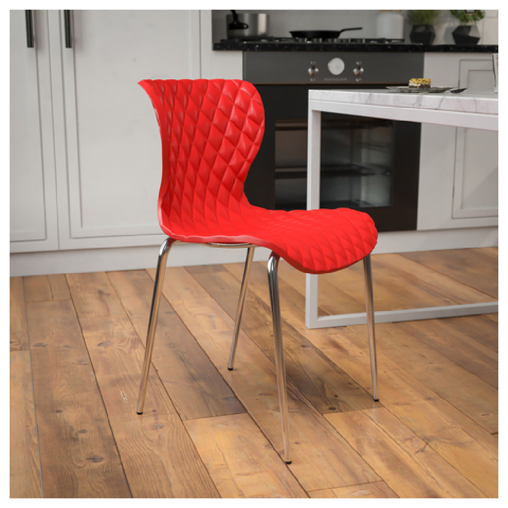 The Flash Furniture LF-7-07C-RED-GG Lowell Chair is a thoughtfully designed seating solution, characterized by its stackable convenience and robust construction. With a weight capacity of 265 pounds, this chair is crafted to support a wide range of users comfortably within its durable framework. The chair features a plastic back and seat, providing a sleek and modern aesthetic that complements various settings, from conference rooms to casual dining areas. Its chrome frame finish not only adds a touch of elegance but also enhances the chair's durability, ensuring it withstands the demands of frequent use. The vibrant red color of the seat and back injects a pop of color into any environment, making it a striking addition to any setup. This chair is particularly beneficial for businesses and venues requiring versatile, easy-to-store seating options, as its stackable nature allows for efficient space management and quick, hassle-free storage. The Flash Furniture LF-7-07C-RED-GG Lowell Chair merges practicality with style, addressing the diverse needs of different market segments that prioritize functionality and aesthetic appeal in high-traffic areas.
